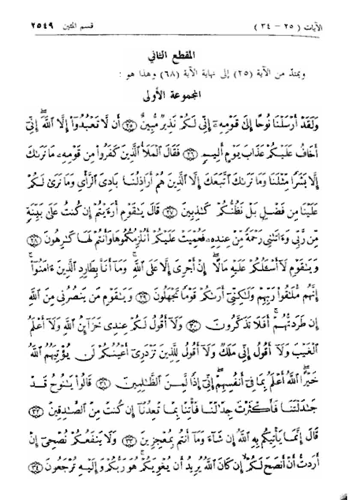 وَلَقَدْ أَرْسَلْنا نُوحاً إِلى قَوْمِهِ إِنِّي لَكُمْ نَذِيرٌ مُبِينٌ (25) أَنْ لا تَعْبُدُوا إِلاَّ اللَّهَ إِنِّي أَخافُ عَلَيْكُمْ عَذابَ يَوْمٍ أَلِيمٍ (26) فَقالَ الْمَلَأُ الَّذِينَ كَفَرُوا مِنْ قَوْمِهِ ما نَراكَ إِلاَّ بَشَراً مِثْلَنا وَما نَراكَ اتَّبَعَكَ إِلاَّ الَّذِينَ هُمْ أَراذِلُنا بادِيَ الرَّأْيِ وَما نَرى لَكُمْ عَلَيْنا مِنْ فَضْلٍ بَلْ نَظُنُّكُمْ كاذِبِينَ (27) قالَ يا قَوْمِ أَرَأَيْتُمْ إِنْ كُنْتُ عَلى بَيِّنَةٍ مِنْ رَبِّي وَآتانِي رَحْمَةً مِنْ عِنْدِهِ فَعُمِّيَتْ عَلَيْكُمْ أَنُلْزِمُكُمُوها وَأَنْتُمْ لَها كارِهُونَ (28) وَيا قَوْمِ لا أَسْئَلُكُمْ عَلَيْهِ مالاً إِنْ أَجرِيَ إِلاَّ عَلَى اللَّهِ وَما أَنَا بِطارِدِ الَّذِينَ آمَنُوا إِنَّهُمْ مُلاقُوا رَبِّهِمْ وَلكِنِّي أَراكُمْ قَوْماً تَجْهَلُونَ (29)