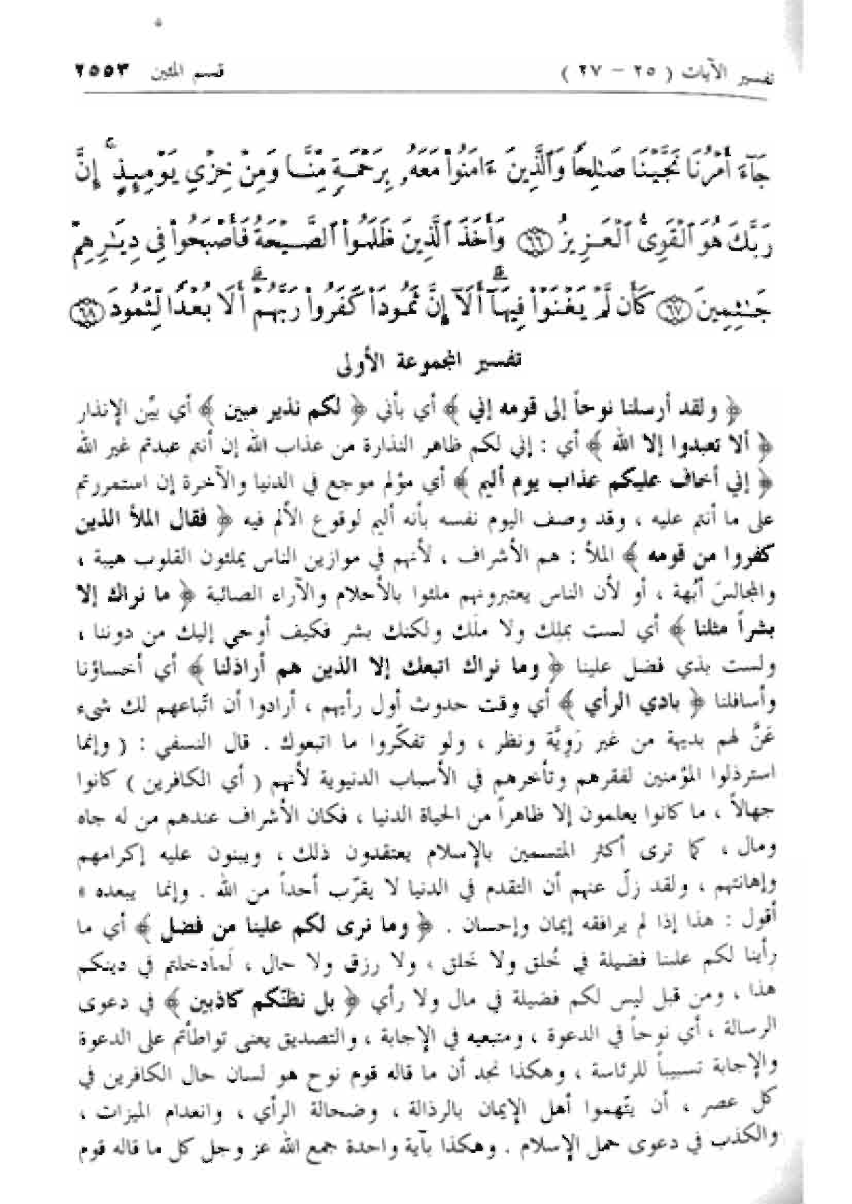 فَقالَ الْمَلَأُ الَّذِينَ كَفَرُوا مِنْ قَوْمِهِ الملأ: هم الأشراف، لأنهم في موازين الناس يملئون القلوب هيبة، والمجالس أبهة، أو لأن الناس يعتبرونهم ملئوا بالأحلام والآراء الصائبة ما نَراكَ إِلَّا بَشَراً مِثْلَنا أي لست بملك ولا ملك ولكنك بشر فكيف أوحي إليك من دوننا، ولست بذي فضل علينا وَما نَراكَ اتَّبَعَكَ إِلَّا الَّذِينَ هُمْ أَراذِلُنا أي أخساؤنا وأسافلنا بادِيَ الرَّأْيِ أي وقت حدوث أول رأيهم، أرادوا أن اتباعهم لك شئ عن لهم بديهة من غير روية ونظر، ولو تفكروا ما اتبعوك. قال النسفي: (وإنما استرذلوا المؤمنين لفقرهم وتأخرهم في الأسباب الدنيوية لأنهم (أي الكافرين) كانوا جهالا، ما كانوا يعلمون إلا ظاهرا من الحياة الدنيا، فكان الأشراف عندهم من له جاه ومال، كما ترى أكثر المتسمين بالإسلام يعتقدون ذلك، ويبنون عليه إكرامهم وإهانتهم، ولقد زل عنهم أن التقدم في الدنيا لا يقرب أحدا من الله. وإنما يبعده» أقول: هذا إذا لم يرافقه إيمان وإحسان. وَما نَرى لَكُمْ عَلَيْنا مِنْ فَضْلٍ أي ما رأينا لكم علينا فضيلة في خلق ولا خلق، ولا رزق ولا حال، لما دخلتم في دينكم هذا، ومن قبل ليس لكم فضيلة في مال ولا رأي بَلْ نَظُنُّكُمْ كاذِبِينَ في دعوى الرسالة، أي نوحا في الدعوة، ومتبعيه في الإجابة، والتصديق يعنى تواطأتم على الدعوة والإجابة تسبيبا للرئاسة، وهكذا نجد أن ما قاله قوم نوح هو لسان حال الكافرين في كل عصر، أن يتهموا أهل الإيمان بالرذالة، وضحالة الرأي، وانعدام الميزات، والكذب في دعوى حمل الإسلام. وهكذا بآية واحدة جمع الله عزّ وجل كل ما قاله قوم