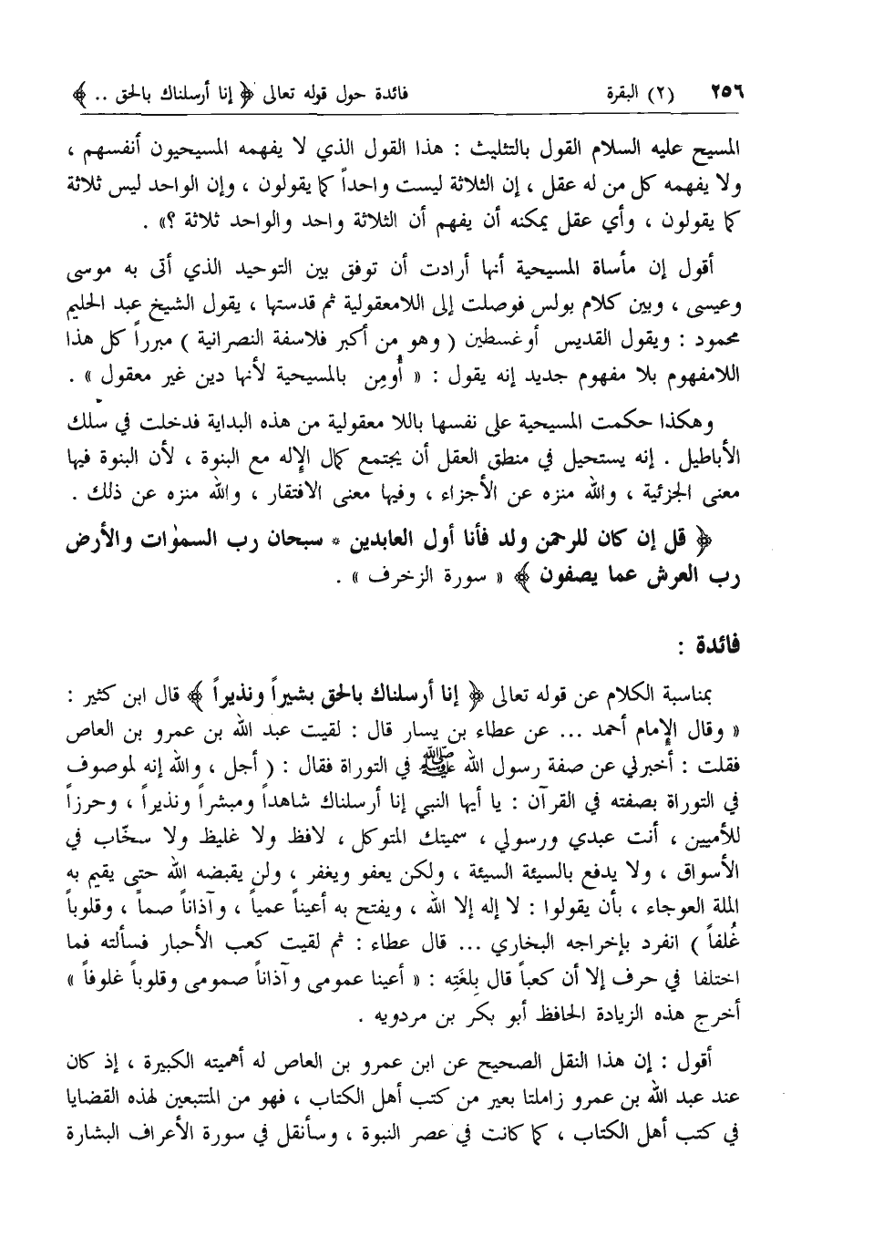أقول: إن هذا النقل الصحيح عن ابن عمرو بن العاص له أهميته الكبيرة، إذ كان عند عبد الله بن عمرو زاملتا بعير من كتب أهل الكتاب، فهو من المتتبعين لهذه القضايا في كتب أهل الكتاب، كما كانت في عصر النبوة، وسأنقل في سورة الأعراف البشارة