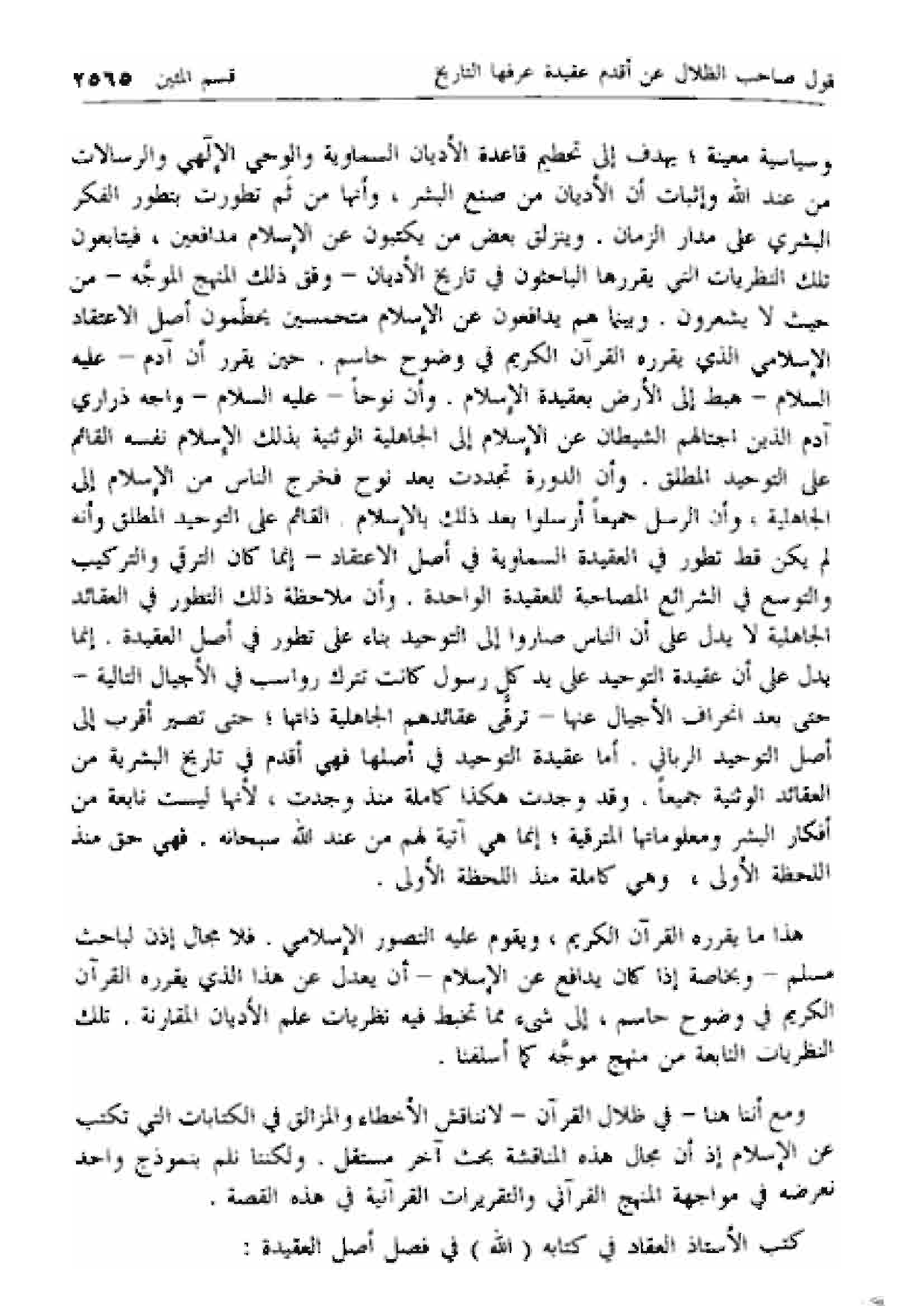 وسياسية معينة؛ يهدف إلى تحطيم قاعدة الأديان السماوية والوحي الإلهي والرسالات من عند الله وإثبات أن الأديان من صنع البشر، وأنها من ثم تطورت بتطور الفكر البشري على مدار الزمان. وينزلق بعض من يكتبون عن الإسلام مدافعين، فيتابعون تلك النظريات التي يقررها الباحثون في تاريخ الأديان- وفق ذلك المنهج الموجه- من حيث لا يشعرون. وبينما هم يدافعون عن الإسلام متحمسين يحطمون أصل الاعتقاد الإسلامي الذي يقرره القرآن الكريم في وضوح حاسم. حين يقرر أن آدم- عليه السلام- هبط إلى الأرض بعقيدة الإسلام. وأن نوحا- عليه السلام- واجه ذراري آدم الذين اجتالهم الشيطان عن الإسلام إلى الجاهلية الوثنية بذلك الإسلام نفسه القائم على التوحيد المطلق. وأن الدورة تجددت بعد نوح فخرج الناس من الإسلام إلى الجاهلية، وأن الرسل جميعا أرسلوا بعد ذلك بالإسلام. القائم على التوحيد المطلق وأنه لم يكن قط تطور في العقيدة السماوية في أصل الاعتقاد- إنما كان الترقي والتركيب والتوسع في الشرائع المصاحبة للعقيدة الواحدة. وأن ملاحظة ذلك التطور في العقائد الجاهلية لا يدل على أن الناس صاروا إلى التوحيد بناء على تطور في أصل العقيدة. إنما يدل على أن عقيدة التوحيد على يد كل رسول كانت تترك رواسب في الأجيال التالية- حتى بعد انحراف الأجيال عنها- ترقى عقائدهم الجاهلية ذاتها؛ حتى تصير أقرب إلى أصل التوحيد الرباني. أما عقيدة التوحيد في أصلها فهي أقدم في تاريخ البشرية من العقائد الوثنية جميعا. وقد وجدت هكذا كاملة منذ وجدت، لأنها ليست نابعة من أفكار البشر ومعلوماتها المترقية؛ إنما هي آتية لهم من عند الله سبحانه. فهي حق منذ اللحظة الأولى، وهي كاملة منذ اللحظة الأولى.