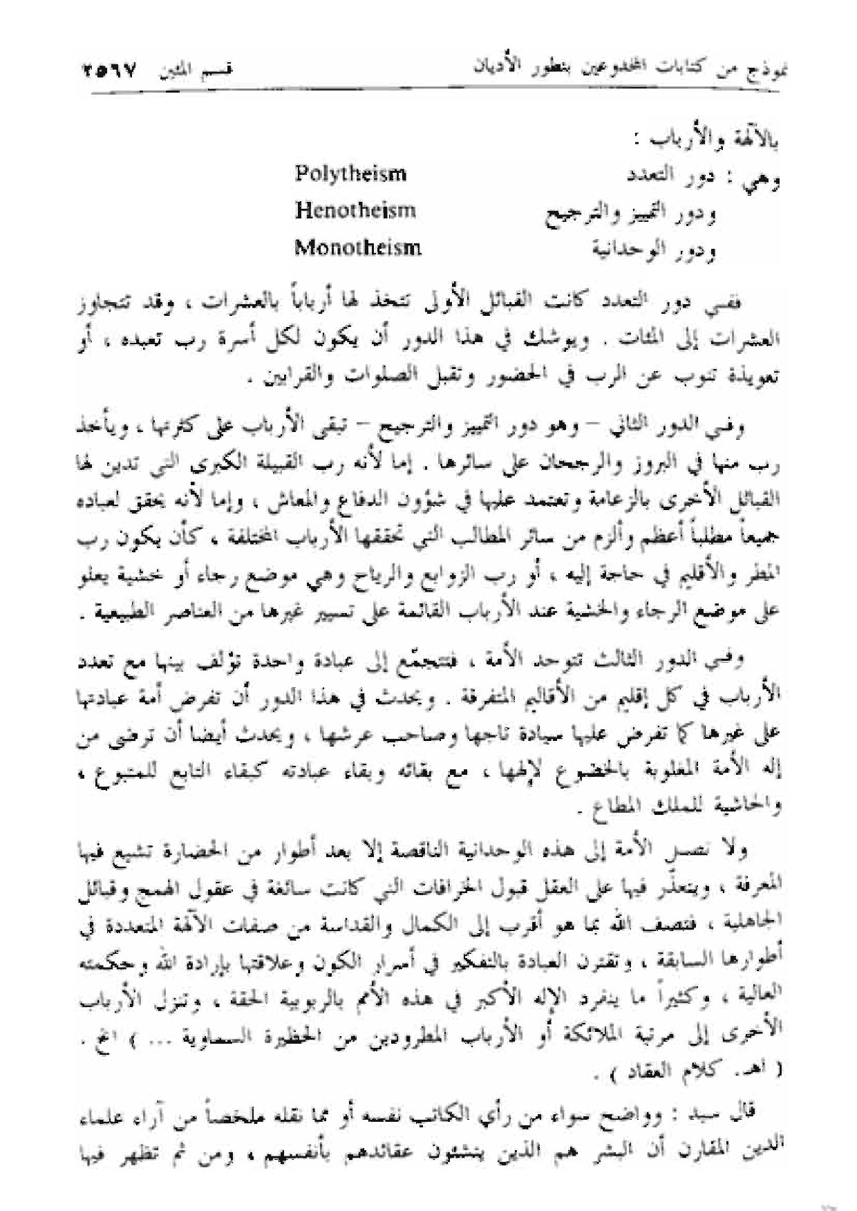 ولا تصل الأمة إلى هذه الوحدانية الناقصة إلا بعد أطوار من الحضارة تشيع فيها المعرفة، ويتعذر فيها على العقل قبول الخرافات التي كانت سائغة في عقول الهمج وقبائل الجاهلية، فتصف الله بما هو أقرب إلى الكمال والقداسة من صفات الآلهة المتعددة في أطوارها السابقة، وتقترن العبادة بالتفكير في أسرار الكون وعلاقتها بإرادة الله وحكمته العالية، وكثيرا ما ينفرد الإله الأكبر في هذه الأمم بالربوبية الحقة، وتنزل الأرباب الأخرى إلى مرتبة الملائكة أو الأرباب المطرودين من الحظيرة السماوية ... ) الخ.