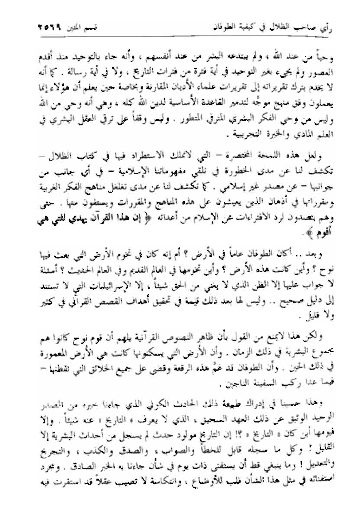 وحيا من عند الله، ولم يبتدعه البشر من عند أنفسهم، وأنه جاء بالتوحيد منذ أقدم العصور ولم يجئ بغير التوحيد في أية فترة من فترات التاريخ، ولا في أية رسالة. كما أنه لا يخدم بترك تقريراته إلى تقريرات علماء الأديان المقارنة وبخاصة حين يعلم أن هؤلاء إنما يعملون وفق منهج موجه لتدمير القاعدة الأساسية لدين الله كله، وهي أنه وحي من الله وليس من وحي الفكر البشري المترقي المتطور. وليس وقفا على ترقي العقل البشري في العلم المادي والخبرة التجريبية.