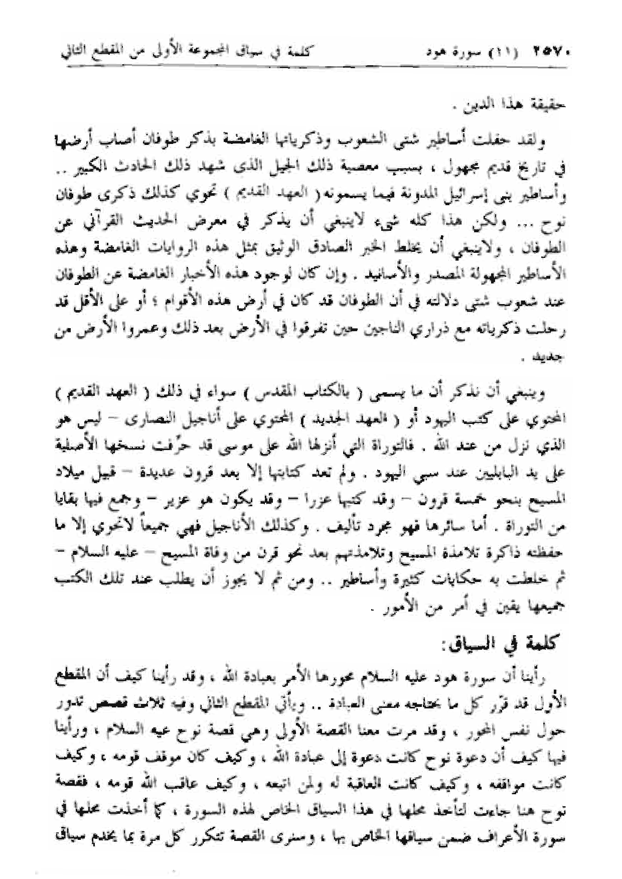 وأساطير بنى إسرائيل المدونة فيما يسمونه (العهد القديم) تحوي كذلك ذكرى طوفان نوح ... ولكن هذا كله شئ لا ينبغي أن يذكر في معرض الحديث القرآني عن الطوفان، ولا ينبغي أن يخلط الخبر الصادق الوثيق بمثل هذه الروايات الغامضة وهذه الأساطير المجهولة المصدر والأسانيد. وإن كان لوجود هذه الأخبار الغامضة عن الطوفان عند شعوب شتى دلالته في أن الطوفان قد كان في أرض هذه الأقوام؛ أو على الأقل قد رحلت ذكرياته مع ذراري الناجين حين تفرقوا في الأرض بعد ذلك وعمروا الأرض من جديد.
