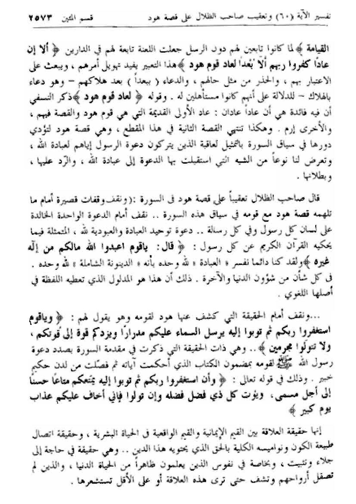 قال صاحب الظلال تعقيبا على قصة هود فى السورة: (ونقف وقفات قصيرة أمام ما تلهمه قصة هود مع قومه في سياق هذه السورة .. نقف أمام الدعوة الواحدة الخالدة على لسان كل رسول وفي كل رسالة .. دعوة توحيد العبادة والعبودية لله، المتمثلة فيما يحكيه القرآن الكريم عن كل رسول: قالَ: يا قَوْمِ اعْبُدُوا اللَّهَ ما لَكُمْ مِنْ إِلهٍ غَيْرُهُ ولقد كنا دائما نفسر «العبادة» لله وحده بأنه «الدينونة الشاملة» لله وحده.