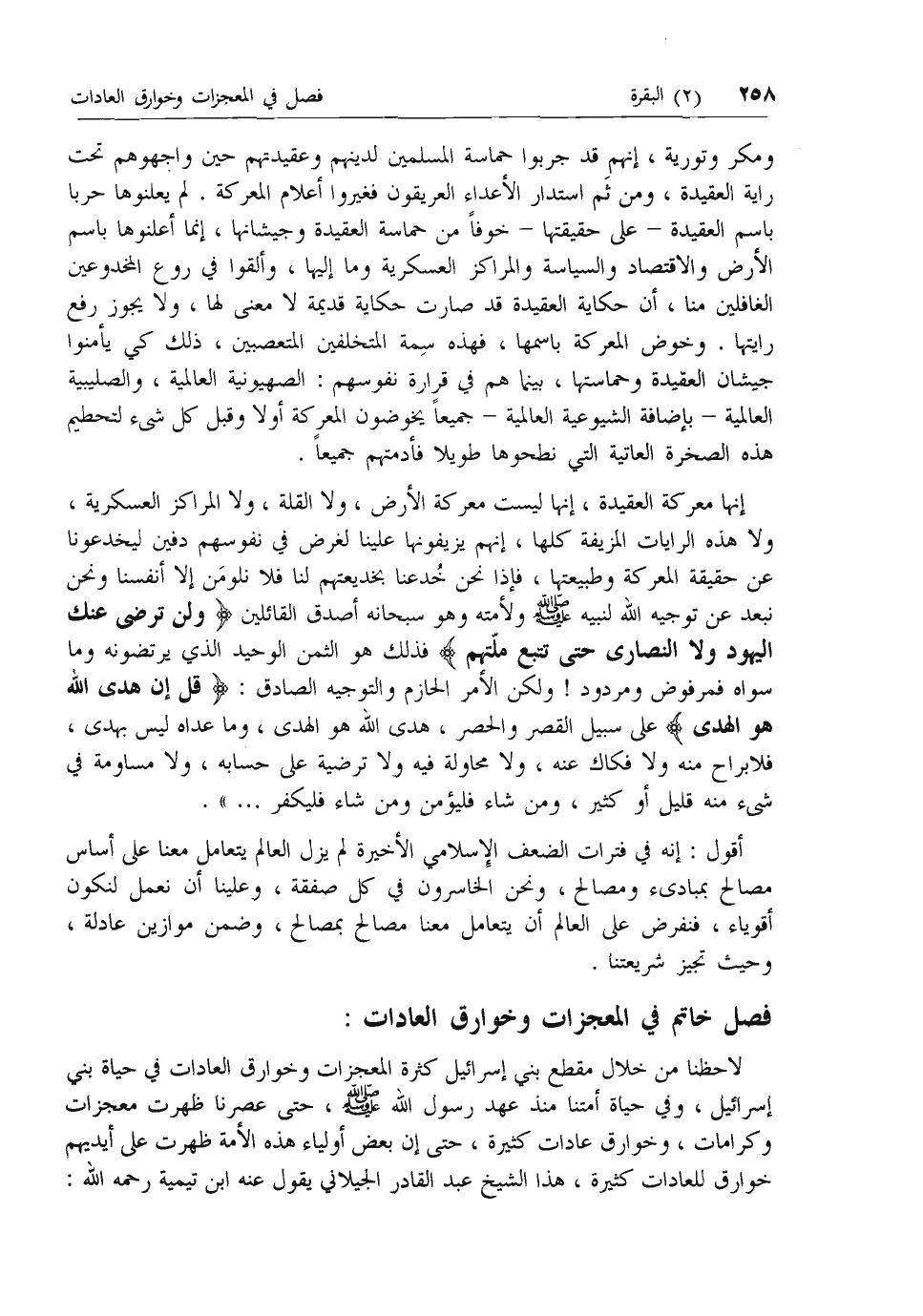 إنها معركة العقيدة، إنها ليست معركة الأرض، ولا القلة، ولا المراكز العسكرية، ولا هذه الروايات المزيفة كلها، إنهم يزيفونها علينا لغرض في نفوسهم دفين ليخدعونا عن حقيقة المعركة وطبيعتها، فإذا نحن خدعنا بخديعتهم لنا فلا نلومن إلا أنفسنا ونحن نبعد عن توجيه الله لنبيه صلى الله عليه وسلم ولأمته وهو سبحانه أصدق القائلين وَلَنْ تَرْضى عَنْكَ الْيَهُودُ وَلَا النَّصارى حَتَّى تَتَّبِعَ مِلَّتَهُمْ فذلك هو الثمن الوحيد الذي يرتضونه وما سواه فمرفوض ومردود! ولكن الأمر الحازم والتوجيه الصادق: قُلْ إِنَّ هُدَى اللَّهِ هُوَ الْهُدى على سبيل القصر والحصر، هدى الله هو الهدى، وما عداه ليس بهدى، فلا براح منه ولا فكاك عنه، ولا محاولة فيه ولا ترضية على حسابه، ولا مساومة في شئ منه قليل أو كثير، ومن شاء فليؤمن ومن شاء فليكفر ... ».