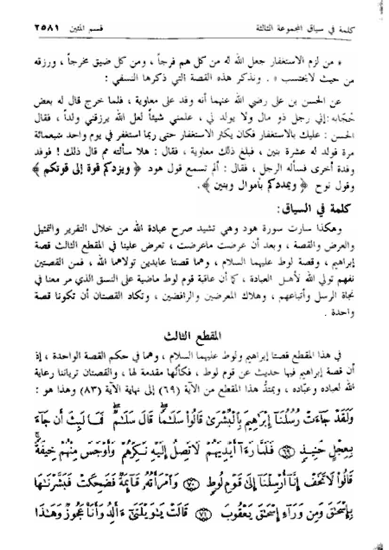 في هذا المقطع قصتا إبراهيم ولوط عليهما السلام، وهما في حكم القصة الواحدة، إذ أن قصة إبراهيم فيها حديث عن قوم لوط، فكأنها مقدمة لها، والقصتان ترياننا رعاية الله لعباده وعباده، ويمتد هذا المقطع من الآية (69) إلى نهاية الآية (83) وهذا هو: