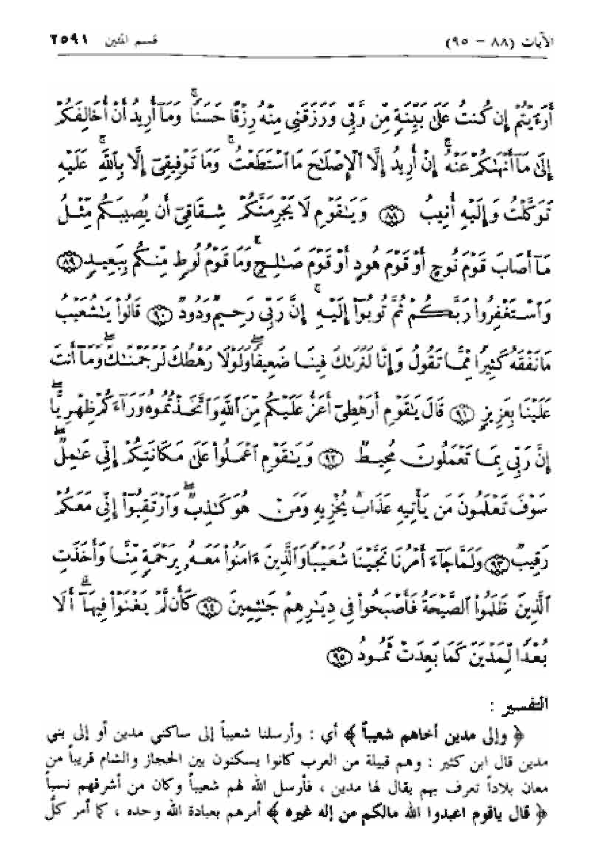 وَإِلى مَدْيَنَ أَخاهُمْ شُعَيْباً أي: وأرسلنا شعيبا إلى ساكني مدين أو إلى بني مدين قال ابن كثير: وهم قبيلة من العرب كانوا يسكنون بين الحجاز والشام قريبا من معان بلادا تعرف بهم يقال لها مدين، فأرسل الله لهم شعيبا وكان من أشرفهم نسبا قالَ يا قَوْمِ اعْبُدُوا اللَّهَ ما لَكُمْ مِنْ إِلهٍ غَيْرُهُ أمرهم بعبادة الله وحده، كما أمر كل