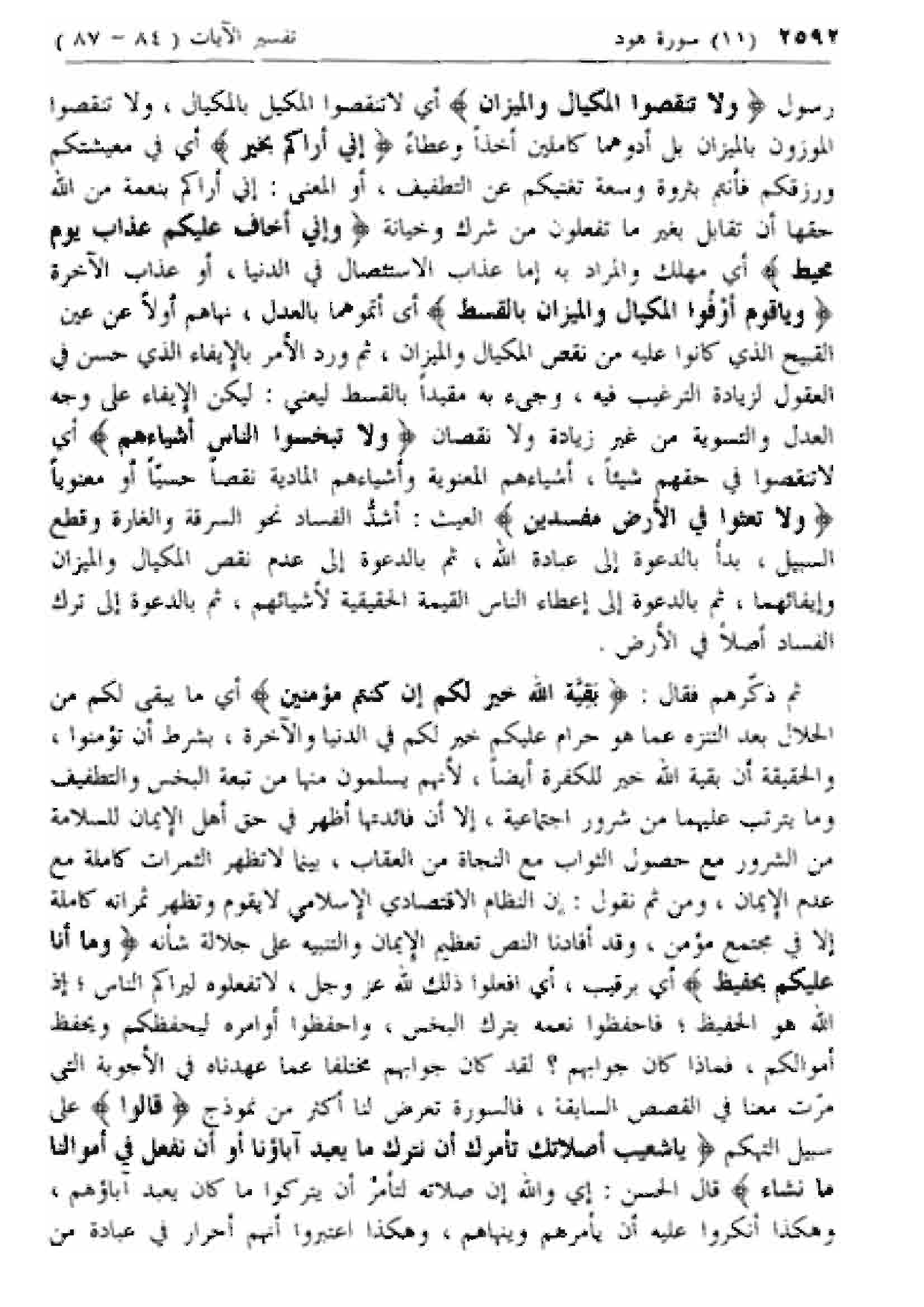وَيا قَوْمِ أَوْفُوا الْمِكْيالَ وَالْمِيزانَ بِالْقِسْطِ أى أتموهما بالعدل، نهاهم أولا عن عين القبيح الذي كانوا عليه من نقص المكيال والميزان، ثم ورد الأمر بالإيفاء الذي حسن في العقول لزيادة الترغيب فيه، وجئ به مقيدا بالقسط ليعني: ليكن الإيفاء على وجه العدل والتسوية من غير زيادة ولا نقصان وَلا تَبْخَسُوا النَّاسَ أَشْياءَهُمْ أي لا تنقصوا في حقهم شيئا، أشياءهم المعنوية وأشياءهم المادية نقصا حسيا أو معنويا وَلا تَعْثَوْا فِي الْأَرْضِ مُفْسِدِينَ العيث: أشد الفساد نحو السرقة والغارة وقطع السبيل، بدأ بالدعوة إلى عبادة الله، ثم بالدعوة إلى عدم نقص المكيال والميزان وإيفائهما، ثم بالدعوة إلى إعطاء الناس القيمة الحقيقية لأشيائهم، ثم بالدعوة إلى ترك الفساد أصلا في الأرض.
