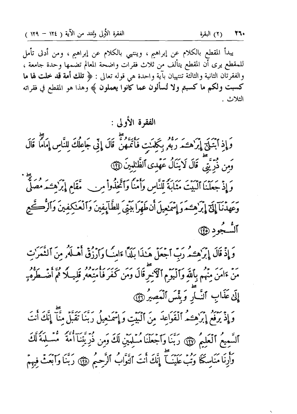 وَإِذِ ابْتَلى إِبْراهِيمَ رَبُّهُ بِكَلِماتٍ فَأَتَمَّهُنَّ قالَ إِنِّي جاعِلُكَ لِلنَّاسِ إِماماً قالَ وَمِنْ ذُرِّيَّتِي قالَ لا يَنالُ عَهْدِي الظَّالِمِينَ (124) وَإِذْ جَعَلْنَا الْبَيْتَ مَثابَةً لِلنَّاسِ وَأَمْناً وَاتَّخِذُوا مِنْ مَقامِ إِبْراهِيمَ مُصَلًّى وَعَهِدْنا إِلى إِبْراهِيمَ وَإِسْماعِيلَ أَنْ طَهِّرا بَيْتِيَ لِلطَّائِفِينَ وَالْعاكِفِينَ وَالرُّكَّعِ السُّجُودِ (125) وَإِذْ قالَ إِبْراهِيمُ رَبِّ اجْعَلْ هذا بَلَداً آمِناً وَارْزُقْ أَهْلَهُ مِنَ الثَّمَراتِ مَنْ آمَنَ مِنْهُمْ بِاللَّهِ وَالْيَوْمِ الْآخِرِ قالَ وَمَنْ كَفَرَ فَأُمَتِّعُهُ قَلِيلاً ثُمَّ أَضْطَرُّهُ إِلى عَذابِ النَّارِ وَبِئْسَ الْمَصِيرُ (126) وَإِذْ يَرْفَعُ إِبْراهِيمُ الْقَواعِدَ مِنَ الْبَيْتِ وَإِسْماعِيلُ رَبَّنا تَقَبَّلْ مِنَّا إِنَّكَ أَنْتَ السَّمِيعُ الْعَلِيمُ (127) رَبَّنا وَاجْعَلْنا مُسْلِمَيْنِ لَكَ وَمِنْ ذُرِّيَّتِنا أُمَّةً مُسْلِمَةً لَكَ وَأَرِنا مَناسِكَنا وَتُبْ عَلَيْنا إِنَّكَ أَنْتَ التَّوَّابُ الرَّحِيمُ (128)