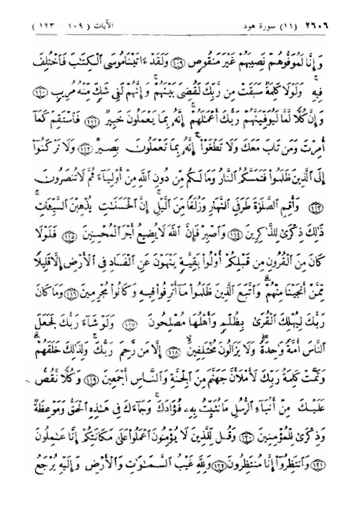 فَلا تَكُ فِي مِرْيَةٍ مِمَّا يَعْبُدُ هؤُلاءِ ما يَعْبُدُونَ إِلاَّ كَما يَعْبُدُ آباؤُهُمْ مِنْ قَبْلُ وَإِنَّا لَمُوَفُّوهُمْ نَصِيبَهُمْ غَيْرَ مَنْقُوصٍ (109) وَلَقَدْ آتَيْنا مُوسَى الْكِتابَ فَاخْتُلِفَ فِيهِ وَلَوْلا كَلِمَةٌ سَبَقَتْ مِنْ رَبِّكَ لَقُضِيَ بَيْنَهُمْ وَإِنَّهُمْ لَفِي شَكٍّ مِنْهُ مُرِيبٍ (110) وَإِنَّ كُلاًّ لَمَّا لَيُوَفِّيَنَّهُمْ رَبُّكَ أَعْمالَهُمْ إِنَّهُ بِما يَعْمَلُونَ خَبِيرٌ (111) فَاسْتَقِمْ كَما أُمِرْتَ وَمَنْ تابَ مَعَكَ وَلا تَطْغَوْا إِنَّهُ بِما تَعْمَلُونَ بَصِيرٌ (112) وَلا تَرْكَنُوا إِلَى الَّذِينَ ظَلَمُوا فَتَمَسَّكُمُ النَّارُ وَما لَكُمْ مِنْ دُونِ اللَّهِ مِنْ أَوْلِياءَ ثُمَّ لا تُنْصَرُونَ (113)