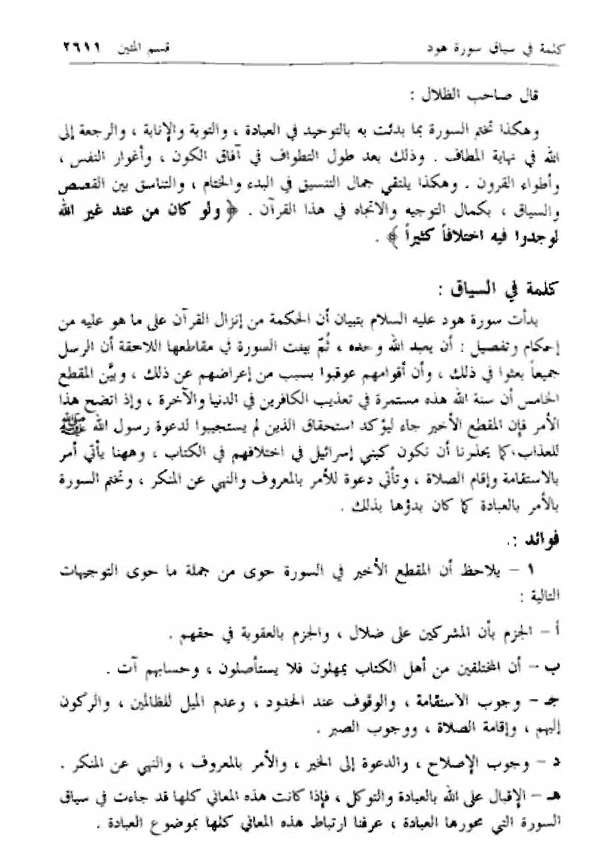 وهكذا تختم السورة بما بدئت به بالتوحيد في العبادة، والتوبة والإنابة، والرجعة إلى الله في نهاية المطاف. وذلك بعد طول التطواف في آفاق الكون، وأغوار النفس، وأطواء القرون. وهكذا يلتقي جمال التنسيق في البدء والختام، والتناسق بين القصص والسياق، بكمال التوجيه والاتجاه في هذا القرآن. وَلَوْ كانَ مِنْ عِنْدِ غَيْرِ اللَّهِ لَوَجَدُوا فِيهِ اخْتِلافاً كَثِيراً.