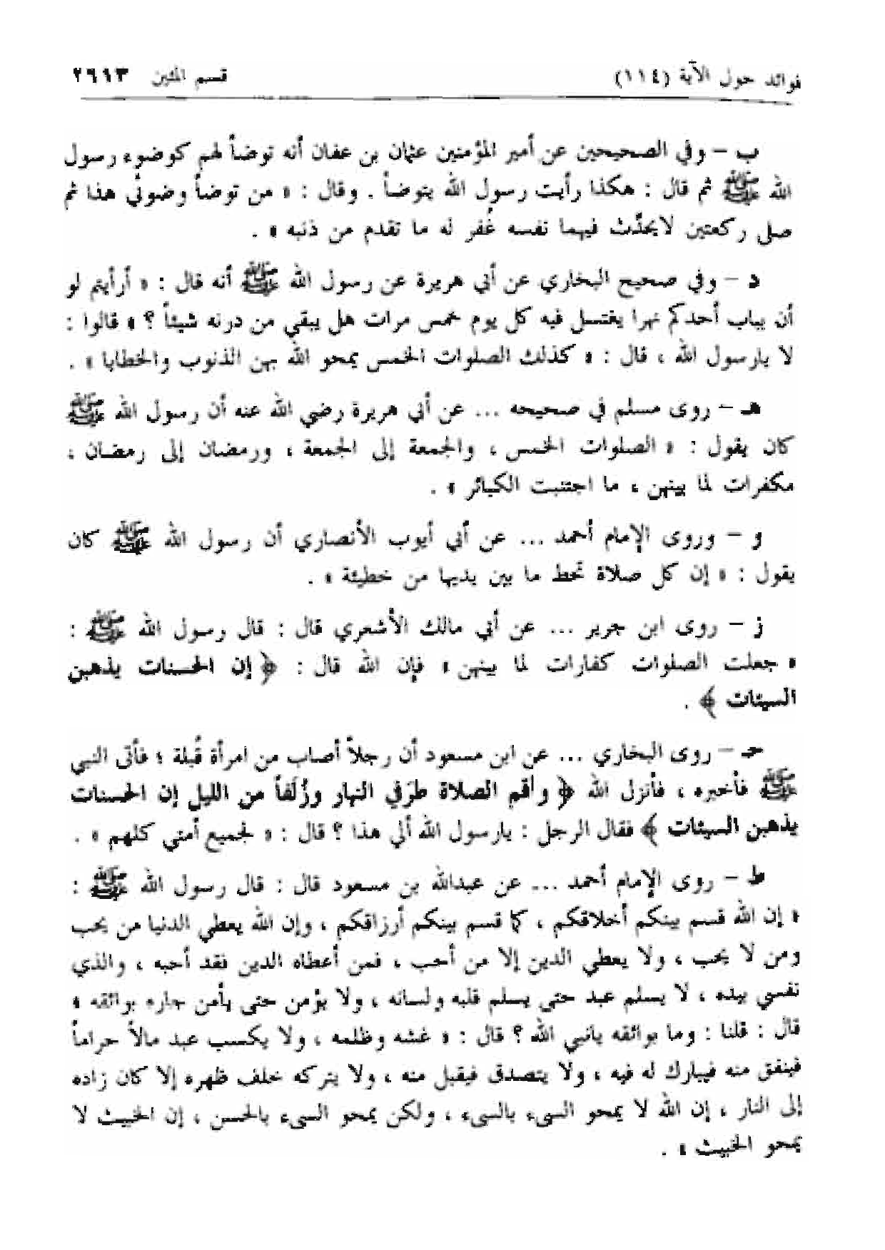 ح- روى البخاري ... عن ابن مسعود أن رجلا أصاب من امرأة قبلة؛ فأتى النبي صلى الله عليه وسلم فأخبره، فأنزل الله وَأَقِمِ الصَّلاةَ طَرَفَيِ النَّهارِ وَزُلَفاً مِنَ اللَّيْلِ إِنَّ الْحَسَناتِ يُذْهِبْنَ السَّيِّئاتِ فقال الرجل: يا رسول الله ألي هذا؟ قال: «لجميع أمتي كلهم».