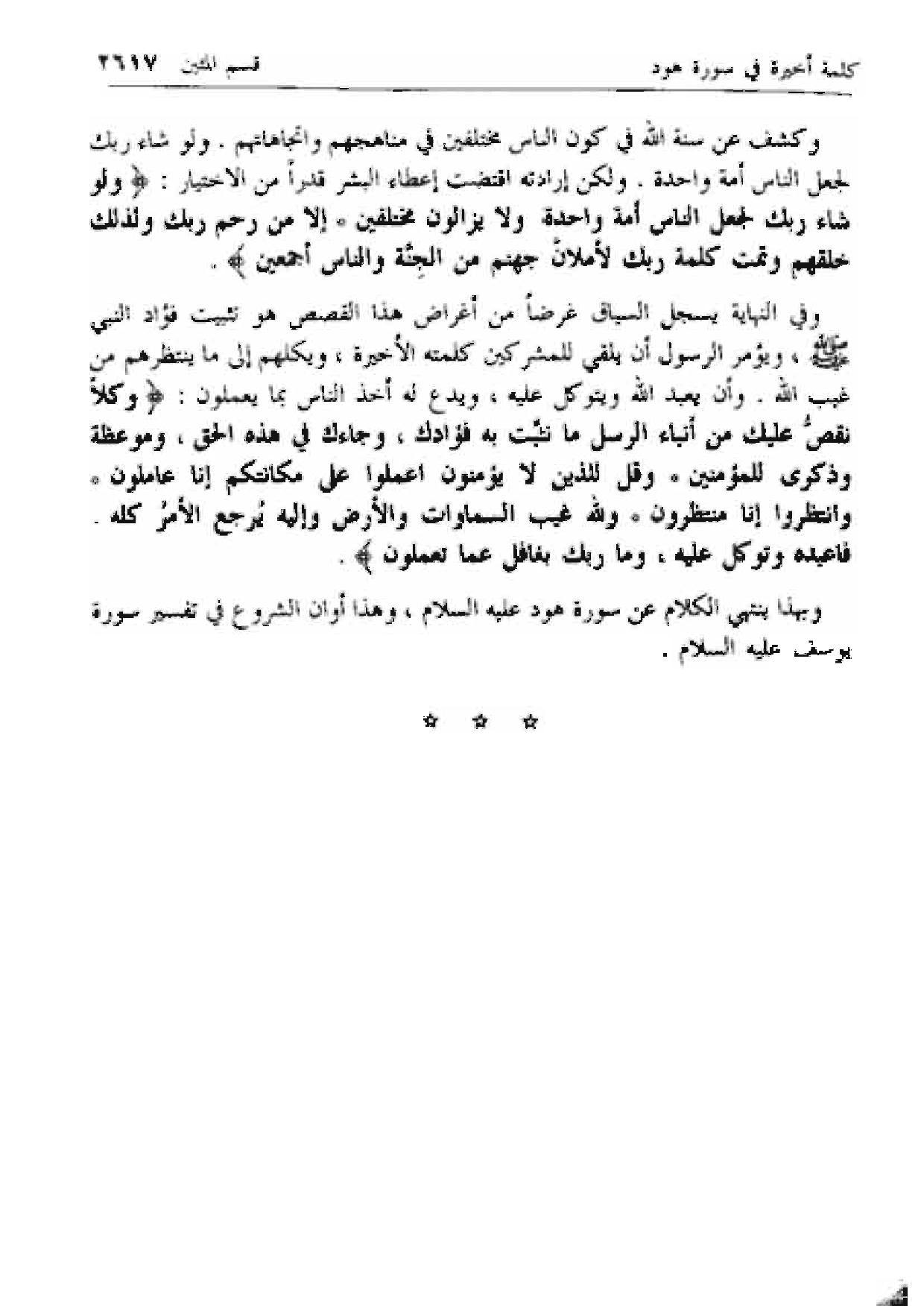 وكشف عن سنة الله في كون الناس مختلفين في مناهجهم واتجاهاتهم. ولو شاء ربك لجعل الناس أمة واحدة. ولكن إرادته اقتضت إعطاء البشر قدرا من الاختيار: وَلَوْ شاءَ رَبُّكَ لَجَعَلَ النَّاسَ أُمَّةً واحِدَةً وَلا يَزالُونَ مُخْتَلِفِينَ* إِلَّا مَنْ رَحِمَ رَبُّكَ وَلِذلِكَ خَلَقَهُمْ وَتَمَّتْ كَلِمَةُ رَبِّكَ لَأَمْلَأَنَّ جَهَنَّمَ مِنَ الْجِنَّةِ وَالنَّاسِ أَجْمَعِينَ.