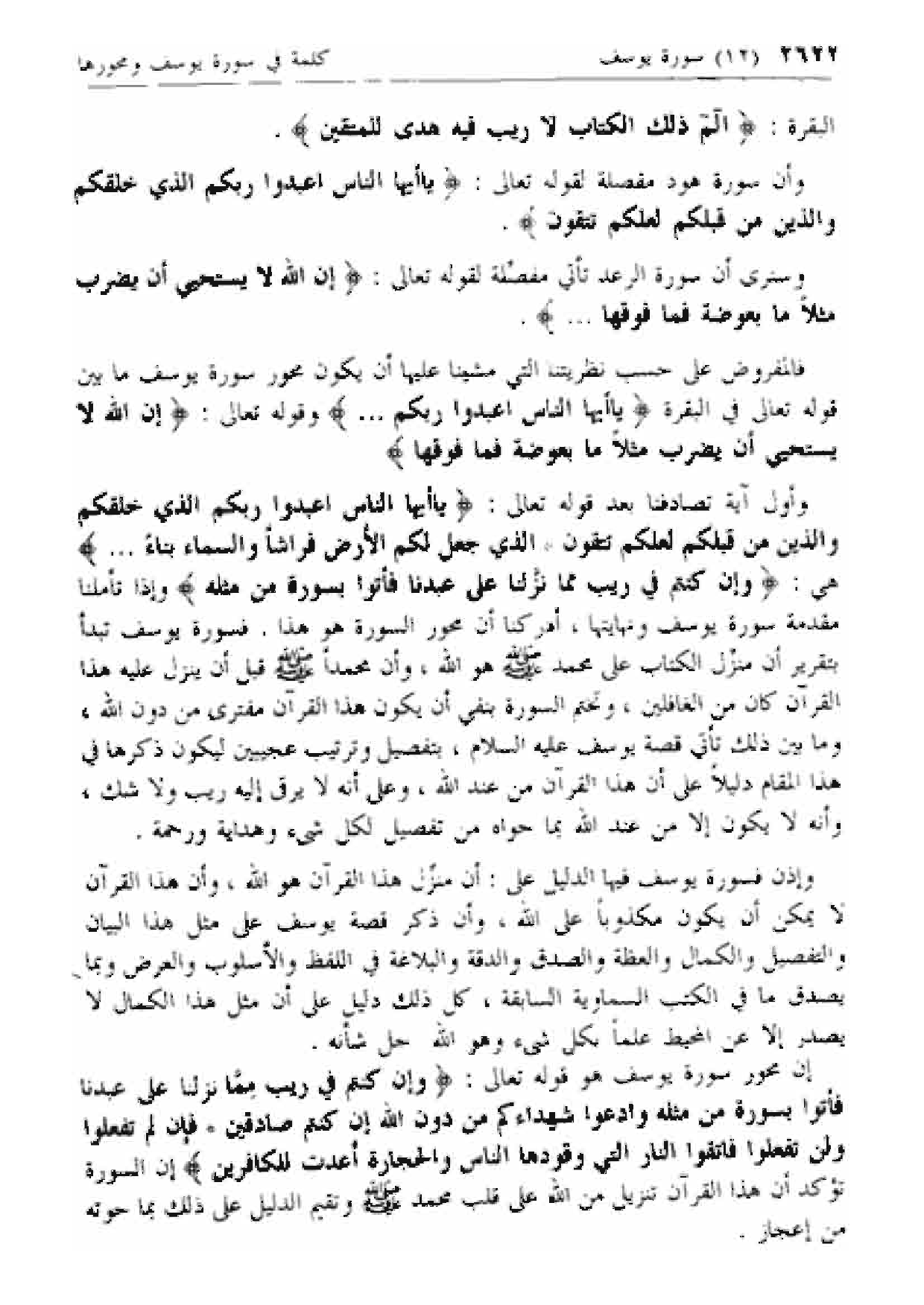 هي: وَإِنْ كُنْتُمْ فِي رَيْبٍ مِمَّا نَزَّلْنا عَلى عَبْدِنا فَأْتُوا بِسُورَةٍ مِنْ مِثْلِهِ وإذا تأملنا مقدمة سورة يوسف ونهايتها، أدركنا أن محور السورة هو هذا. فسورة يوسف تبدأ بتقرير أن منزل الكتاب على محمد صلى الله عليه وسلم هو الله، وأن محمدا صلى الله عليه وسلم قبل أن ينزل عليه هذا القرآن كان من الغافلين، وتختم السورة بنفي أن يكون هذا القرآن مفترى من دون الله، وما بين ذلك تأتي قصة يوسف عليه السلام، بتفصيل وترتيب عجيبين ليكون ذكرها في هذا المقام دليلا على أن هذا القرآن من عند الله، وعلى أنه لا يرقى إليه ريب ولا شك، وأنه لا يكون إلا من عند الله بما حواه من تفصيل لكل شئ وهداية ورحمة.