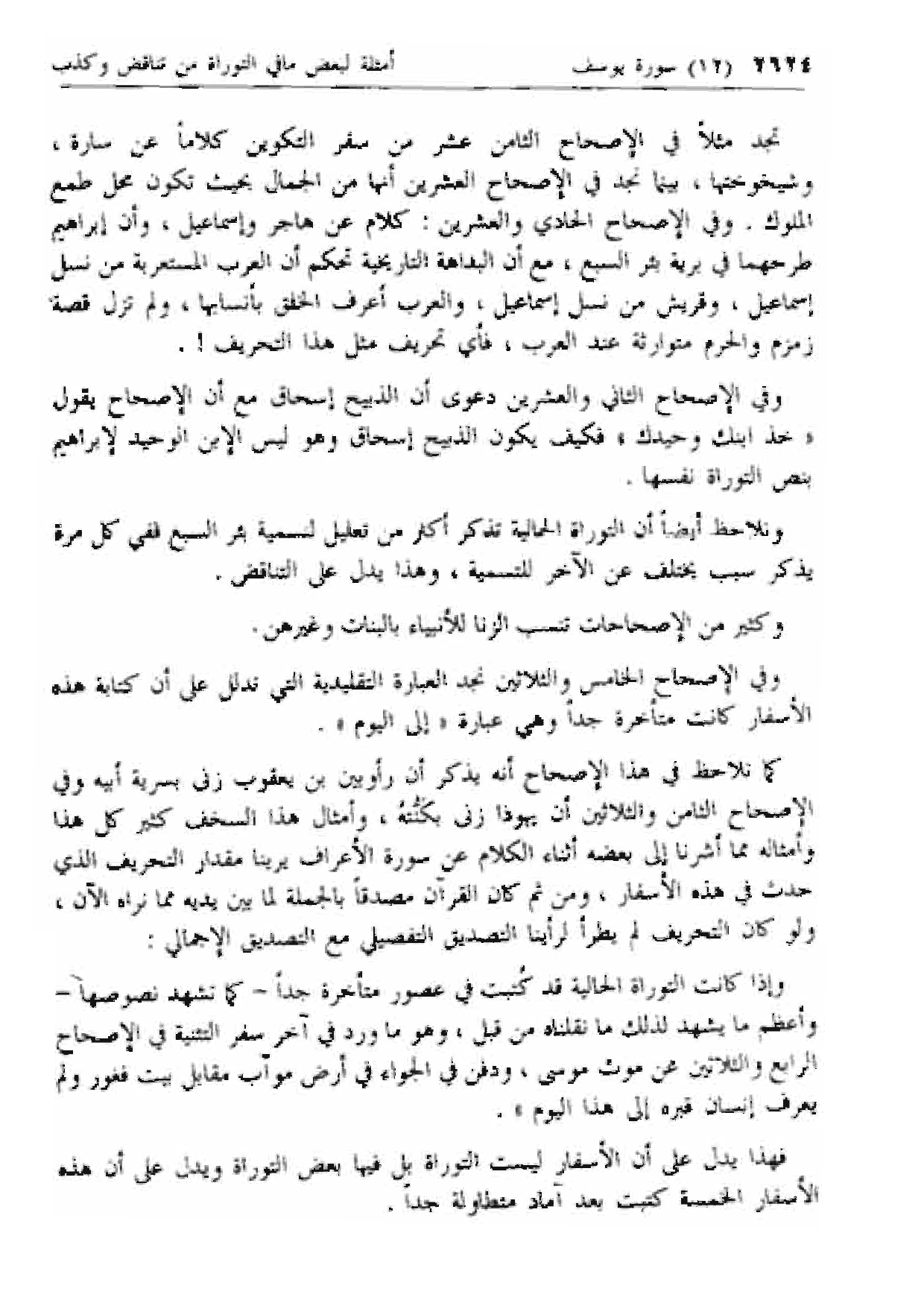 كما نلاحظ في هذا الإصحاح أنه يذكر أن رأوبين بن يعقوب زنى بسرية أبيه وفي الإصحاح الثامن والثلاثين أن يهوذا زنى بكنته، وأمثال هذا السخف كثير كل هذا وأمثاله مما أشرنا إلى بعضه أثناء الكلام عن سورة الأعراف يرينا مقدار التحريف الذي حدث في هذه الأسفار، ومن ثم كان القرآن مصدقا بالجملة لما بين يديه مما نراه الآن، ولو كان التحريف لم يطرأ لرأينا التصديق التفصيلي مع التصديق الإجمالي: