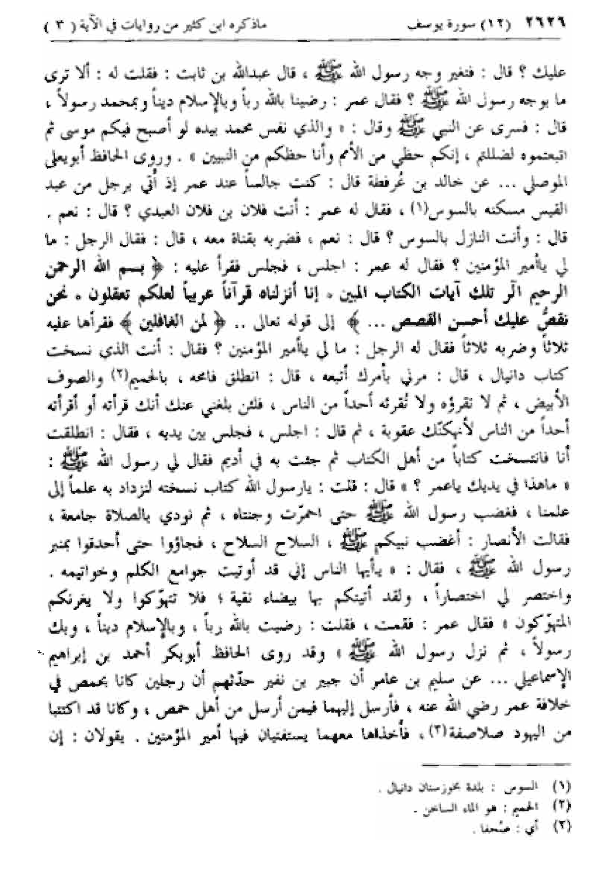 قال: وأنت النازل بالسوس؟ قال: نعم، فضربه بقناة معه، قال: فقال الرجل: ما لي يا أمير المؤمنين؟ فقال له عمر: اجلس، فجلس فقرأ عليه: بِسْمِ اللَّهِ الرَّحْمنِ الرَّحِيمِ الر تِلْكَ آياتُ الْكِتابِ الْمُبِينِ* إِنَّا أَنْزَلْناهُ قُرْآناً عَرَبِيًّا لَعَلَّكُمْ تَعْقِلُونَ* نَحْنُ نَقُصُّ عَلَيْكَ أَحْسَنَ الْقَصَصِ ... إلى قوله تعالى .. لَمِنَ الْغافِلِينَ فقرأها عليه ثلاثا وضربه ثلاثا فقال له الرجل: ما لي يا أمير المؤمنين؟ فقال: أنت الذي نسخت كتاب دانيال، قال: مرني بأمرك أتبعه، قال: انطلق فامحه، بالحميم (¬2) والصوف الأبيض، ثم لا تقرؤه ولا تقرئه أحدا من الناس، فلئن بلغني عنك أنك قرأته أو أقرأته أحدا من الناس لأنهكنك عقوبة، ثم قال: اجلس، فجلس بين يديه، فقال: انطلقت أنا فانتسخت كتابا من أهل الكتاب ثم جئت به في أديم فقال لي رسول الله صلى الله عليه وسلم: