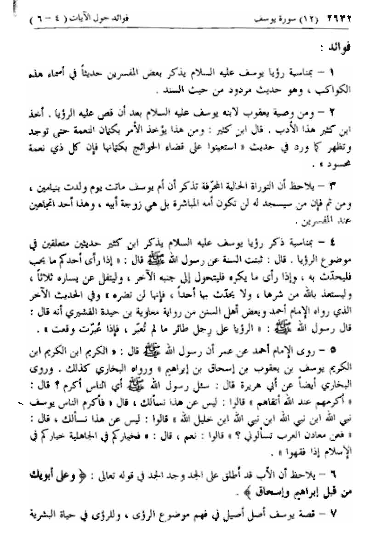 4 - بمناسبة ذكر رؤيا يوسف عليه السلام يذكر ابن كثير حديثين متعلقين في موضوع الرؤيا. قال: ثبتت السنة عن رسول الله صلى الله عليه وسلم قال: «إذا رأى أحدكم ما يحب فليحدث به، وإذا رأى ما يكره فليتحول إلى جنبه الآخر، وليتفل عن يساره ثلاثا، وليستعذ بالله من شرها، ولا يحدث بها أحدا، فإنها لن تضره» وفي الحديث الآخر الذي رواه الإمام أحمد وبعض أهل السنن من رواية معاوية بن حيدة القشيري أنه قال: