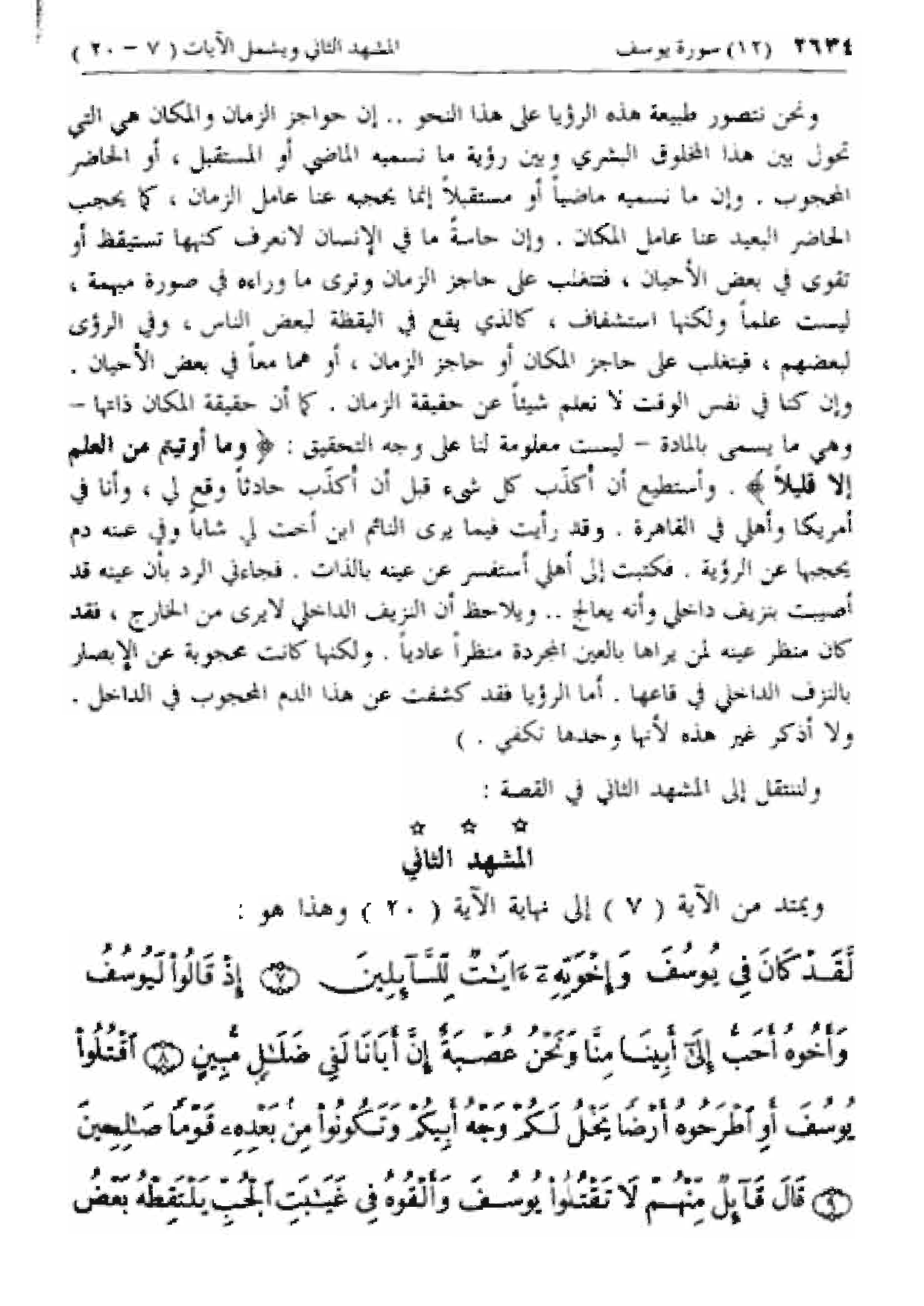 ونحن نتصور طبيعة هذه الرؤيا على هذا النحو .. إن حواجز الزمان والمكان هي التي تحول بين هذا المخلوق البشري وبين رؤية ما نسميه الماضي أو المستقبل، أو الحاضر المحجوب. وإن ما نسميه ماضيا أو مستقبلا إنما يحجبه عنا عامل الزمان، كما يحجب الحاضر البعيد عنا عامل المكان. وإن حاسة ما في الإنسان لا نعرف كنهها تستيقظ أو تقوى في بعض الأحيان، فتتغلب على حاجز الزمان وترى ما وراءه في صورة مبهمة، ليست علما ولكنها استشفاف، كالذي يقع في اليقظة لبعض الناس، وفي الرؤى لبعضهم، فيتغلب على حاجز المكان أو حاجز الزمان، أو هما معا في بعض الأحيان.