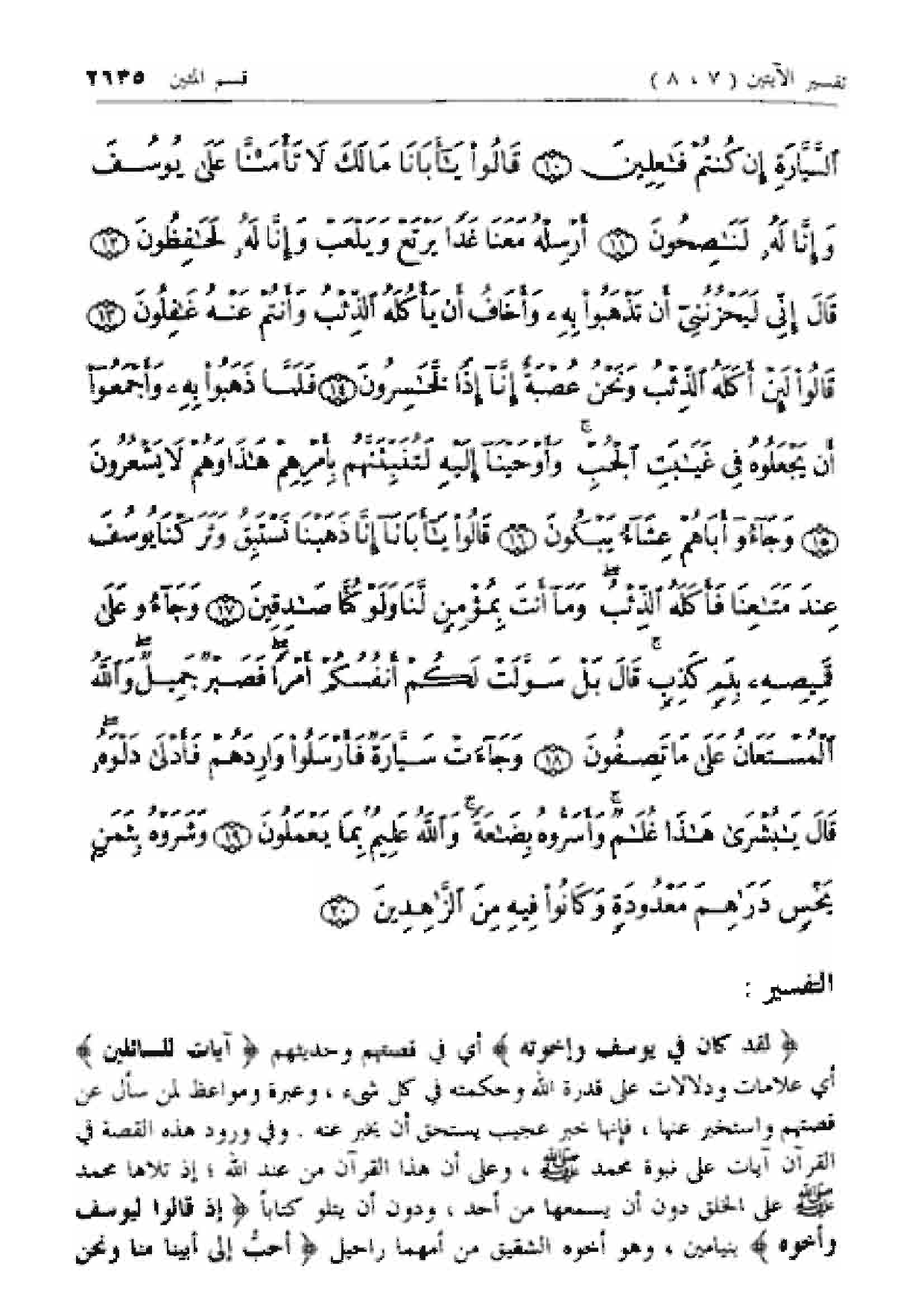 لَقَدْ كانَ فِي يُوسُفَ وَإِخْوَتِهِ أي في قصتهم وحديثهم آياتٌ لِلسَّائِلِينَ أي علامات ودلالات على قدرة الله وحكمته في كل شئ، وعبرة ومواعظ لمن سأل عن قصتهم واستخبر عنها، فإنها خبر عجيب يستحق أن يخبر عنه. وفي ورود هذه القصة في القرآن آيات على نبوة محمد صلى الله عليه وسلم، وعلى أن هذا القرآن من عند الله؛ إذ تلاها محمد صلى الله عليه وسلم على الخلق دون أن يسمعها من أحد، ودون أن يتلو كتابا
