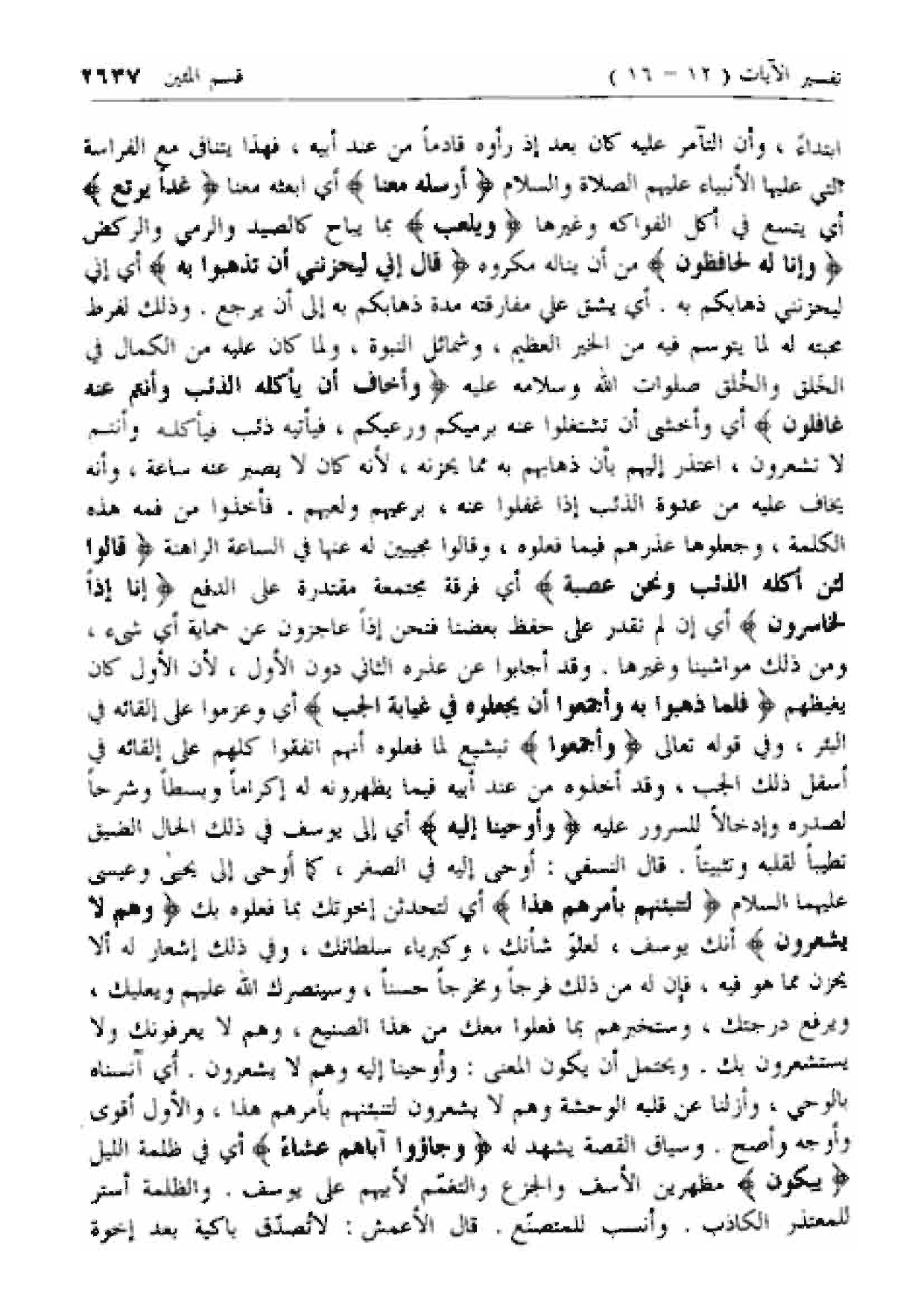 قالَ إِنِّي لَيَحْزُنُنِي أَنْ تَذْهَبُوا بِهِ أي إني ليحزنني ذهابكم به. أي يشق علي مفارقته مدة ذهابكم به إلى أن يرجع. وذلك لفرط محبته له لما يتوسم فيه من الخير العظيم، وشمائل النبوة، ولما كان عليه من الكمال في الخلق والخلق صلوات الله وسلامه عليه وَأَخافُ أَنْ يَأْكُلَهُ الذِّئْبُ وَأَنْتُمْ عَنْهُ غافِلُونَ أي وأخشى أن تشتغلوا عنه برميكم ورعيكم، فيأتيه ذئب فيأكله وأنتم لا تشعرون، اعتذر إليهم بأن ذهابهم به مما يحزنه، لأنه كان لا يصبر عنه ساعة، وأنه يخاف عليه من عدوة الذئب إذا غفلوا عنه، برعيهم ولعبهم. فأخذوا من فمه هذه الكلمة، وجعلوها عذرهم فيما فعلوه، وقالوا مجيبين له عنها في الساعة الراهنة