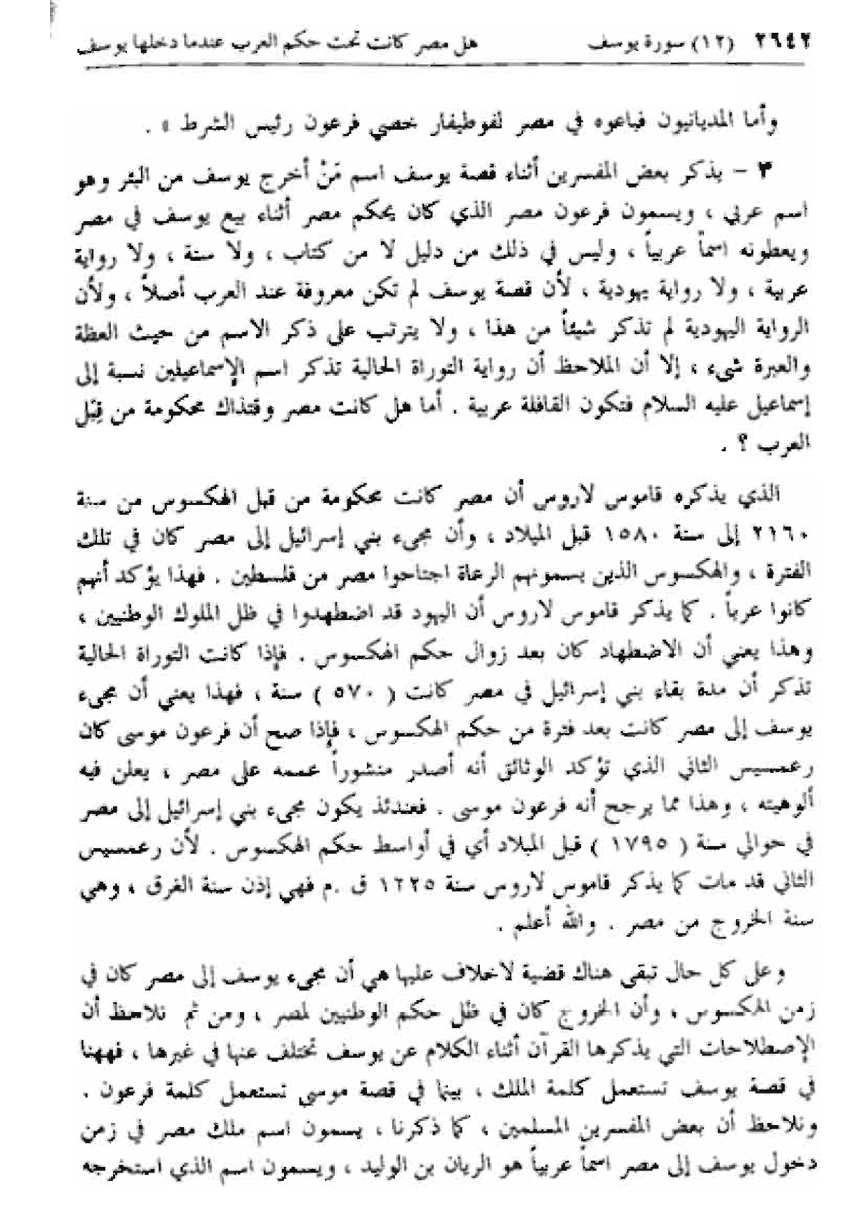 وعلى كل حال تبقى هناك قضية لا خلاف عليها هي أن مجئ يوسف إلى مصر كان في زمن الهكسوس، وأن الخروج كان في ظل حكم الوطنيين لمصر، ومن ثم نلاحظ أن الاصطلاحات التي يذكرها القرآن أثناء الكلام عن يوسف تختلف عنها في غيرها، فههنا في قصة يوسف تستعمل كلمة الملك، بينما في قصة موسى تستعمل كلمة فرعون.