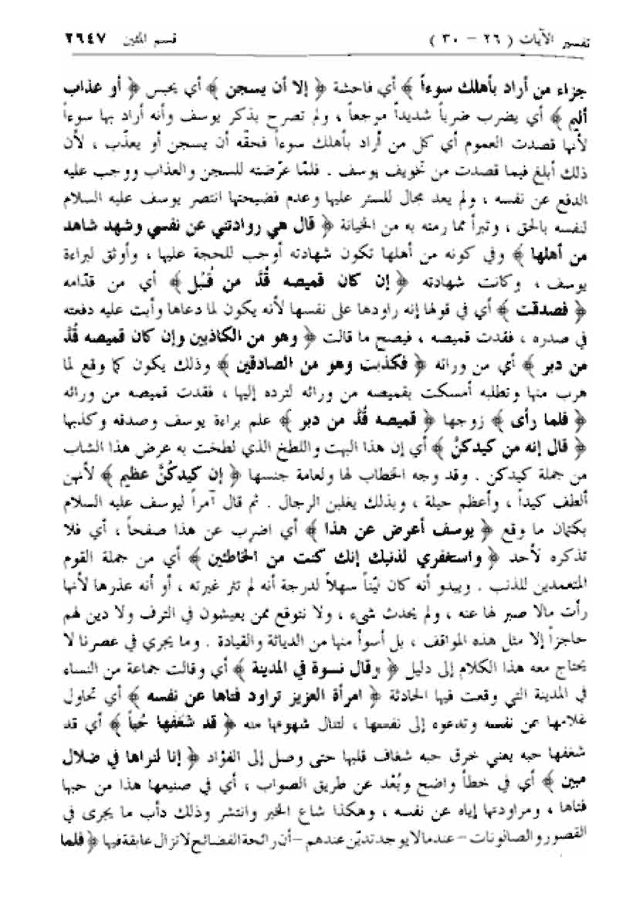 ثم قال آمرا ليوسف عليه السلام بكتمان ما وقع يُوسُفُ أَعْرِضْ عَنْ هذا أي اضرب عن هذا صفحا، أي فلا تذكره لأحد وَاسْتَغْفِرِي لِذَنْبِكِ إِنَّكِ كُنْتِ مِنَ الْخاطِئِينَ أي من جملة القوم المتعمدين للذنب. ويبدو أنه كان لينا سهلا لدرجة أنه لم تثر غيرته، أو أنه عذرها لأنها رأت ما لا صبر لها عنه، ولم يحدث شئ، ولا نتوقع ممن يعيشون في الترف ولا دين لهم حاجزا إلا مثل هذه المواقف، بل أسوأ منها من الدياثة والقيادة. وما يجري في عصرنا لا يحتاج معه هذا الكلام إلى دليل