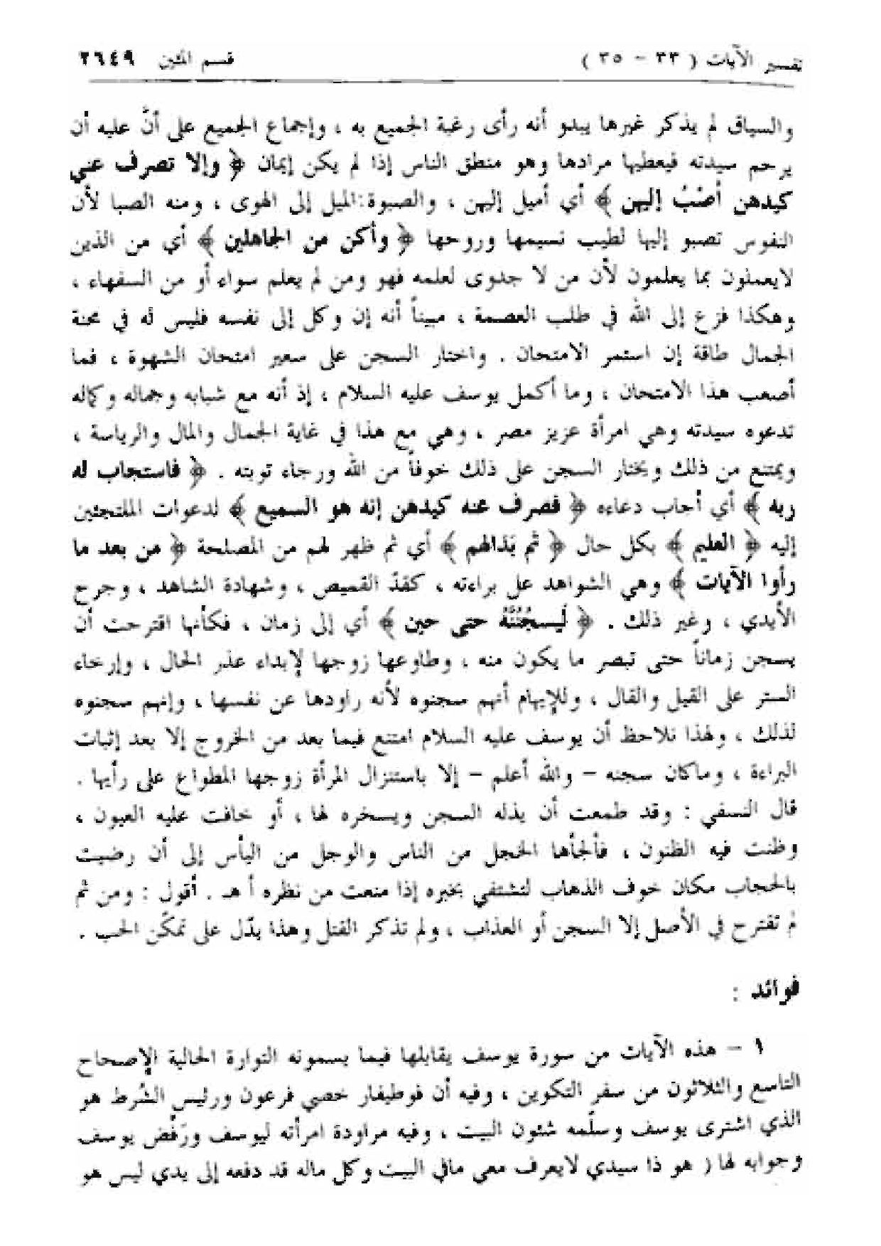 والسياق لم يذكر غيرها يبدو أنه رأى رغبة الجميع به، وإجماع الجميع على أن عليه أن يرحم سيدته فيعطيها مرادها وهو منطق الناس إذا لم يكن إيمان وَإِلَّا تَصْرِفْ عَنِّي كَيْدَهُنَّ أَصْبُ إِلَيْهِنَّ أي أميل إليهن، والصبوة: الميل إلى الهوى، ومنه الصبا لأن النفوس تصبو إليها لطيب نسيمها وروحها وَأَكُنْ مِنَ الْجاهِلِينَ أي من الذين لا يعملون بما يعلمون لأن من لا جدوى لعلمه فهو ومن لم يعلم سواء أو من السفهاء، وهكذا فزع إلى الله في طلب العصمة، مبينا أنه إن وكل إلى نفسه فليس له في محنة الجمال طاقة إن استمر الامتحان. واختار السجن على سعير امتحان الشهوة، فما أصعب هذا الامتحان، وما أكمل يوسف عليه السلام، إذ أنه مع شبابه وجماله وكماله تدعوه سيدته وهي امرأة عزيز مصر، وهي مع هذا في غاية الجمال والمال والرئاسة، ويمتنع من ذلك ويختار السجن على ذلك خوفا من الله ورجاء توبته.