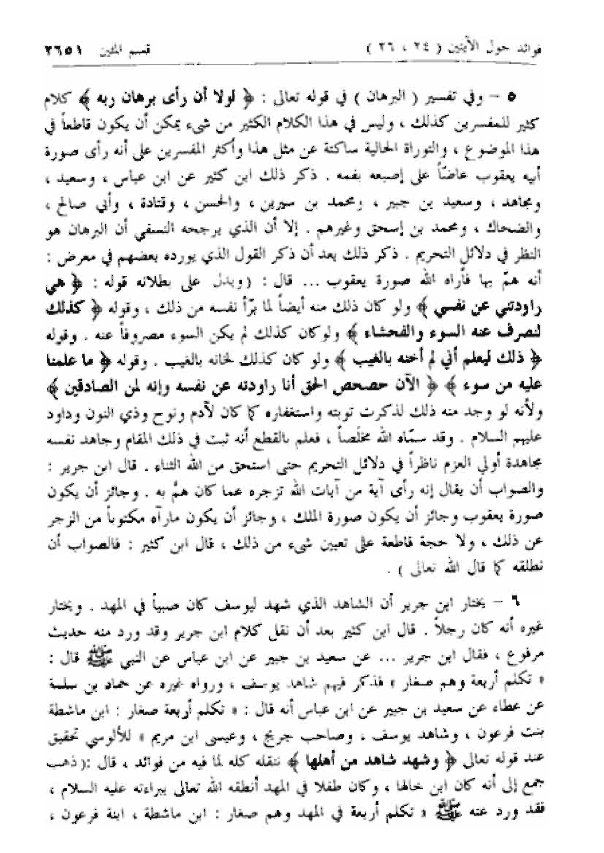 6 - يختار ابن جرير أن الشاهد الذي شهد ليوسف كان صبيا في المهد. ويختار غيره أنه كان رجلا. قال ابن كثير بعد أن نقل كلام ابن جرير وقد ورد منه حديث مرفوع، فقال ابن جرير ... عن سعيد بن جبير عن ابن عباس عن النبي صلى الله عليه وسلم قال: