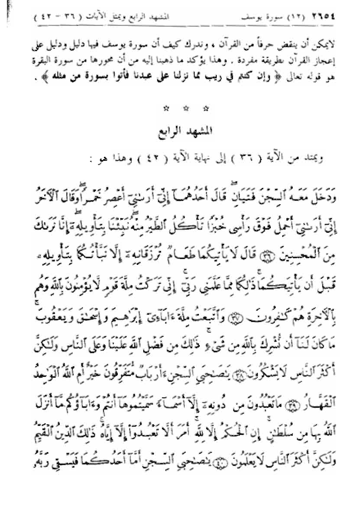 وَدَخَلَ مَعَهُ السِّجْنَ فَتَيانِ قالَ أَحَدُهُما إِنِّي أَرانِي أَعْصِرُ خَمْراً وَقالَ الْآخَرُ إِنِّي أَرانِي أَحْمِلُ فَوْقَ رَأْسِي خُبْزاً تَأْكُلُ الطَّيْرُ مِنْهُ نَبِّئْنا بِتَأْوِيلِهِ إِنَّا نَراكَ مِنَ الْمُحْسِنِينَ (36) قالَ لا يَأْتِيكُما طَعامٌ تُرْزَقانِهِ إِلاَّ نَبَّأْتُكُما بِتَأْوِيلِهِ قَبْلَ أَنْ يَأْتِيَكُما ذلِكُما مِمَّا عَلَّمَنِي رَبِّي إِنِّي تَرَكْتُ مِلَّةَ قَوْمٍ لا يُؤْمِنُونَ بِاللَّهِ وَهُمْ بِالْآخِرَةِ هُمْ كافِرُونَ (37) وَاتَّبَعْتُ مِلَّةَ آبائِي إِبْراهِيمَ وَإِسْحاقَ وَيَعْقُوبَ ما كانَ لَنا أَنْ نُشْرِكَ بِاللَّهِ مِنْ شَيْءٍ ذلِكَ مِنْ فَضْلِ اللَّهِ عَلَيْنا وَعَلَى النَّاسِ وَلكِنَّ أَكْثَرَ النَّاسِ لا يَشْكُرُونَ (38) يا صاحِبَيِ السِّجْنِ أَأَرْبابٌ مُتَفَرِّقُونَ خَيْرٌ أَمِ اللَّهُ الْواحِدُ الْقَهَّارُ (39) ما تَعْبُدُونَ مِنْ دُونِهِ إِلاَّ أَسْماءً سَمَّيْتُمُوها أَنْتُمْ وَآباؤُكُمْ ما أَنْزَلَ اللَّهُ بِها مِنْ سُلْطانٍ إِنِ الْحُكْمُ إِلاَّ لِلَّهِ أَمَرَ أَلاَّ تَعْبُدُوا إِلاَّ إِيَّاهُ ذلِكَ الدِّينُ الْقَيِّمُ وَلكِنَّ أَكْثَرَ النَّاسِ لا يَعْلَمُونَ (40)