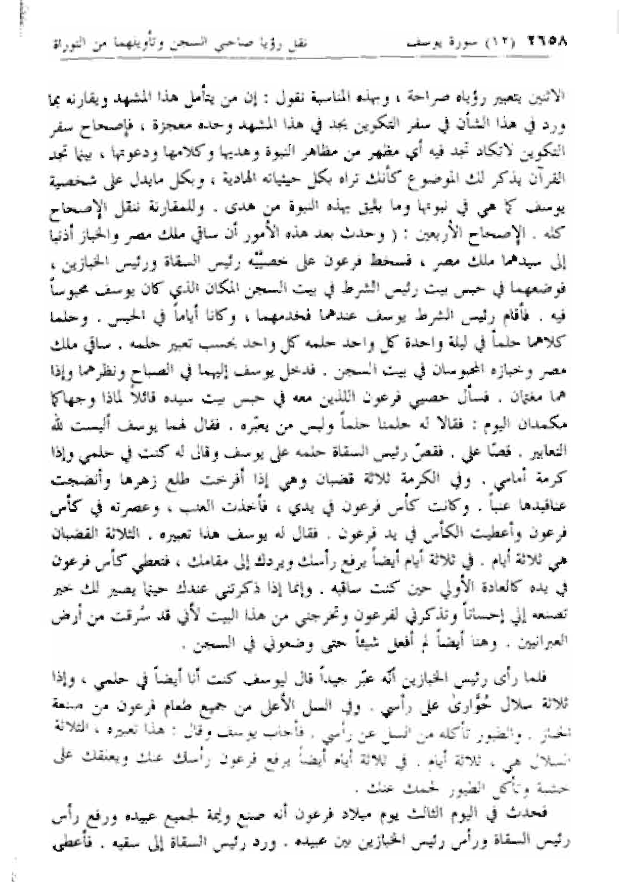 الاثنين بتعبير رؤياه صراحة، وبهذه المناسبة نقول: إن من يتأمل هذا المشهد ويقارنه بما ورد في هذا الشأن في سفر التكوين يجد في هذا المشهد وحده معجزة، فإصحاح سفر التكوين لا تكاد تجد فيه أي مظهر من مظاهر النبوة وهديها وكلامها ودعوتها، بينما تجد القرآن يذكر لك الموضوع كأنك تراه بكل حيثياته الهادية، وبكل ما يدل على شخصية يوسف كما هي في نبوتها وما يليق بهذه النبوة من هدى. وللمقارنة ننقل الإصحاح كله. الإصحاح الأربعين: (وحدث بعد هذه الأمور أن ساقي ملك مصر والخباز أذنبا إلى سيدهما ملك مصر، فسخط فرعون على خصييه رئيس السقاة ورئيس الخبازين، فوضعهما في حبس بيت رئيس الشرط في بيت السجن المكان الذي كان يوسف محبوسا فيه. فأقام رئيس الشرط يوسف عندهما فخدمهما، وكانا أياما في الحبس. وحلما كلاهما حلما في ليلة واحدة كل واحد حلمه كل واحد بحسب تعبير حلمه. ساقي ملك مصر وخبازه المحبوسان في بيت السجن. فدخل يوسف إليهما في الصباح ونظرهما وإذا هما مغتمان. فسأل خصيي فرعون اللذين معه في حبس بيت سيده قائلا لماذا وجهاكما مكمدان اليوم: فقالا له حلمنا حلما وليس من يعبره. فقال لهما يوسف أليست لله التعابير. قصا علي. فقص رئيس السقاة حلمه على يوسف وقال له كنت في حلمي وإذا كرمة أمامي. وفي الكرمة ثلاثة قضبان وهي إذا أفرخت طلع زهرها وأنضجت عناقيدها عنبا. وكانت كأس فرعون في يدي، فأخذت العنب، وعصرته في كأس فرعون وأعطيت الكأس في يد فرعون. فقال له يوسف هذا تعبيره. الثلاثة القضبان هي ثلاثة أيام. في ثلاثة أيام أيضا يرفع رأسك ويردك إلى مقامك، فتعطي كأس فرعون في يده كالعادة الأولي حين كنت ساقيه. وإنما إذا ذكرتني عندك حينما يصير لك خير تصنعه إلي إحسانا وتذكرني لفرعون وتخرجني من هذا البيت لأني قد سرقت من أرض العبرانيين. وهنا أيضا لم أفعل شيئا حتى وضعوني في السجن.