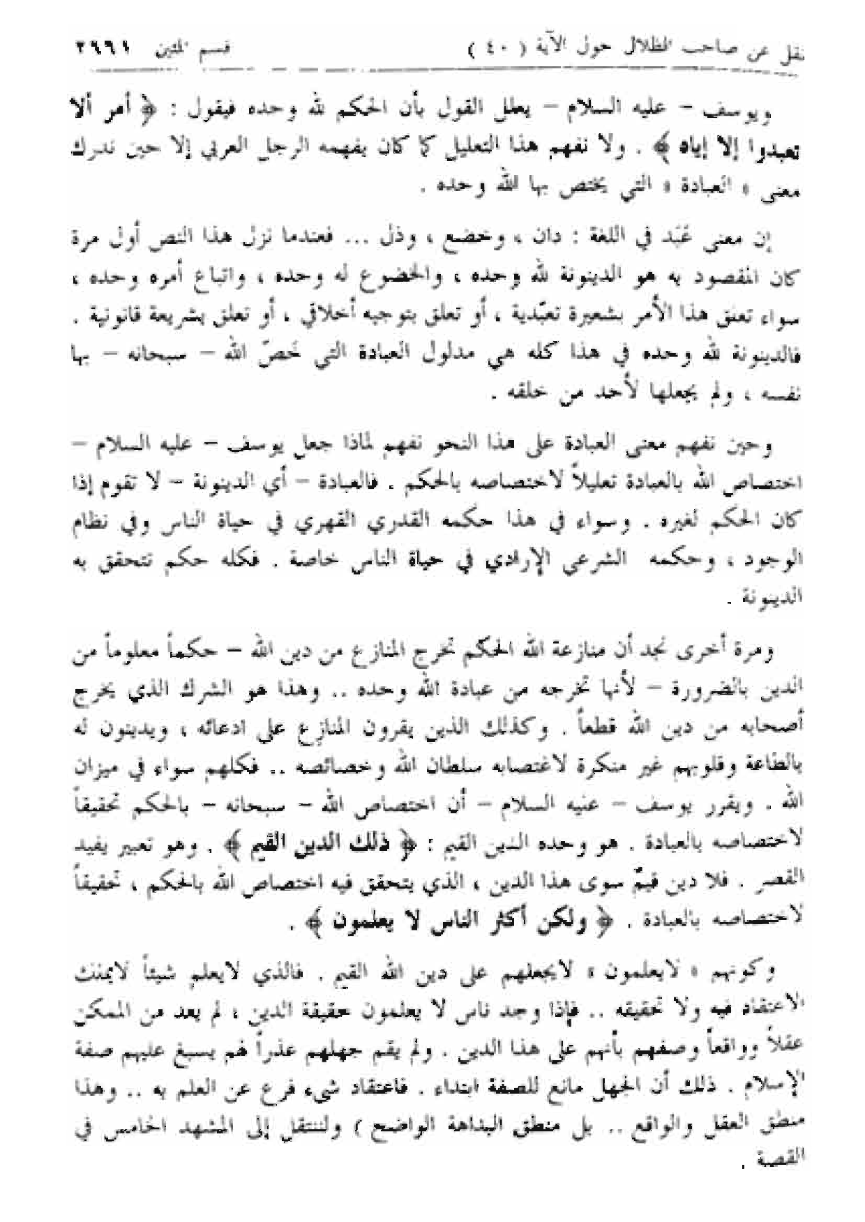 ومرة أخرى نجد أن منازعة الله الحكم تخرج المنازع من دين الله- حكما معلوما من الدين بالضرورة- لأنها تخرجه من عبادة الله وحده .. وهذا هو الشرك الذي يخرج أصحابه من دين الله قطعا. وكذلك الذين يقرون المنازع على ادعائه، ويدينون له بالطاعة وقلوبهم غير منكرة لاغتصابه سلطان الله وخصائصه .. فكلهم سواء في ميزان الله. ويقرر يوسف- عليه السلام- أن اختصاص الله- سبحانه- بالحكم تحقيقا لاختصاصه بالعبادة. هو وحده الدين القيم: ذلِكَ الدِّينُ الْقَيِّمُ. وهو تعبير يفيد القصر. فلا دين قيم سوى هذا الدين، الذي يتحقق فيه اختصاص الله بالحكم، تحقيقا لاختصاصه بالعبادة. وَلكِنَّ أَكْثَرَ النَّاسِ لا يَعْلَمُونَ.