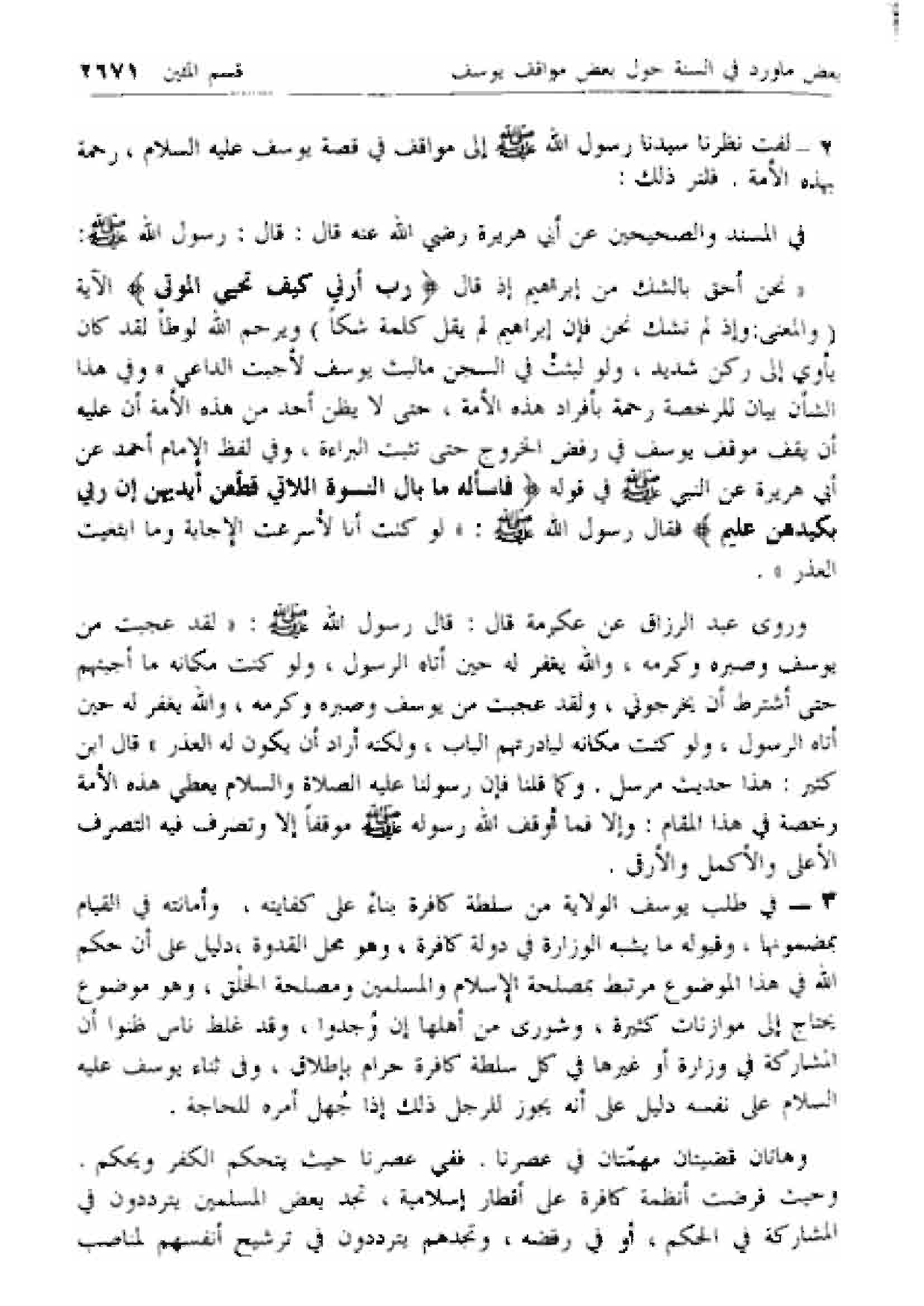 3 - في طلب يوسف الولاية من سلطة كافرة بناء على كفايته، وأمانته في القيام بمضمونها، وقبوله ما يشبه الوزارة في دولة كافرة، وهو محل القدوة، دليل على أن حكم الله في هذا الموضوع مرتبط بمصلحة الإسلام والمسلمين ومصلحة الخلق، وهو موضوع يحتاج إلى موازنات كثيرة، وشورى من أهلها إن وجدوا، وقد غلط ناس ظنوا أن المشاركة في وزارة أو غيرها في كل سلطة كافرة حرام بإطلاق، وفى ثناء يوسف عليه السلام على نفسه دليل على أنه يجوز للرجل ذلك إذا جهل أمره للحاجة.