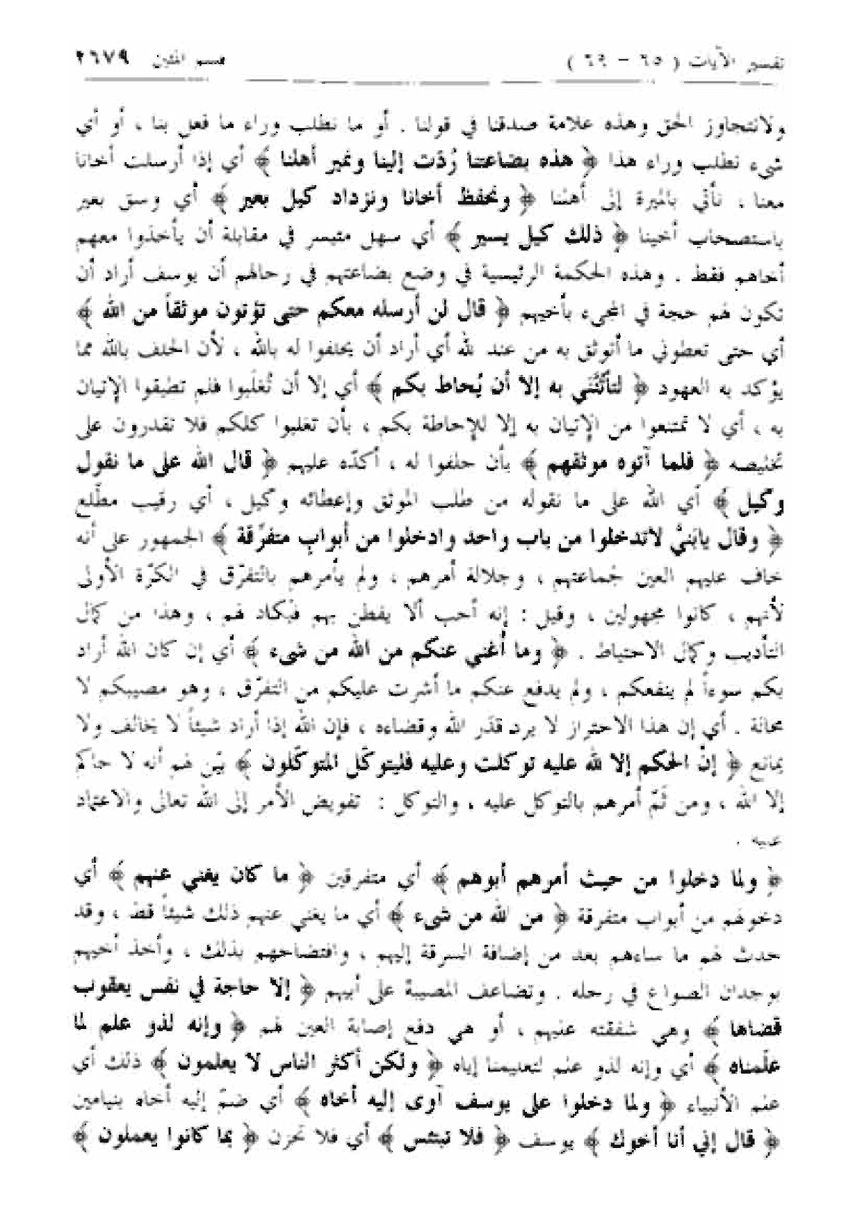 وَقالَ يا بَنِيَّ لا تَدْخُلُوا مِنْ بابٍ واحِدٍ وَادْخُلُوا مِنْ أَبْوابٍ مُتَفَرِّقَةٍ الجمهور على أنه خاف عليهم العين لجماعتهم، وجلالة أمرهم، ولم يأمرهم بالتفرق في الكرة الأولى لأنهم، كانوا مجهولين، وقيل: إنه أحب ألا يفطن بهم فيكاد لهم، وهذا من كمال التأديب وكمال الاحتياط. وَما أُغْنِي عَنْكُمْ مِنَ اللَّهِ مِنْ شَيْءٍ أي إن كان الله أراد بكم سوءا لم ينفعكم، ولم يدفع عنكم ما أشرت عليكم من التفرق، وهو مصيبكم لا محالة. أي إن هذا الاحتراز لا يرد قدر الله وقضاءه، فإن الله إذا أراد شيئا لا يخالف ولا يمانع إِنِ الْحُكْمُ إِلَّا لِلَّهِ عَلَيْهِ تَوَكَّلْتُ وَعَلَيْهِ فَلْيَتَوَكَّلِ الْمُتَوَكِّلُونَ بين لهم أنه لا حاكم إلا الله، ومن ثم أمرهم بالتوكل عليه، والتوكل: تفويض الأمر إلى الله تعالى والاعتماد عليه.