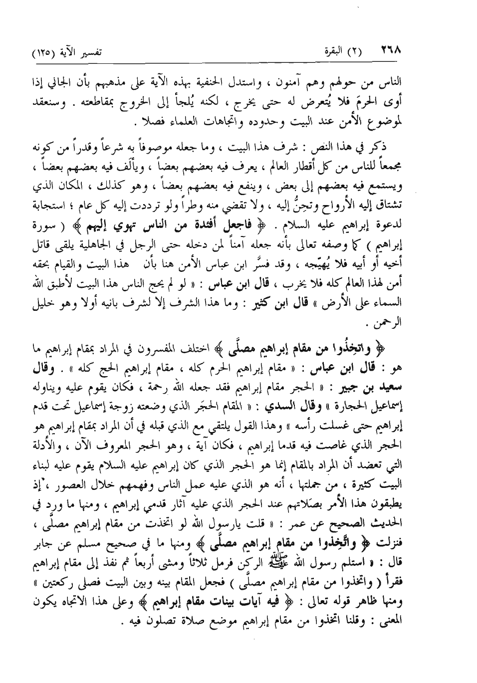 وَاتَّخِذُوا مِنْ مَقامِ إِبْراهِيمَ مُصَلًّى اختلف المفسرون في المراد بمقام إبراهيم ما هو: قال ابن عباس: «مقام إبراهيم الحرم كله، مقام إبراهيم الحج كله». وقال سعيد بن جبير: «الحجر مقام إبراهيم فقد جعله الله رحمة، فكان يقوم عليه ويناوله إسماعيل الحجارة» وقال السدي: «المقام الحجر الذي وضعته زوجة إسماعيل تحت قدم إبراهيم حتى غسلت رأسه» وهذا القول يلتقي مع الذي قبله في أن المراد بمقام إبراهيم هو الحجر الذي غاصت فيه قدما إبراهيم، فكان آية، وهو الحجر المعروف الآن، والأدلة