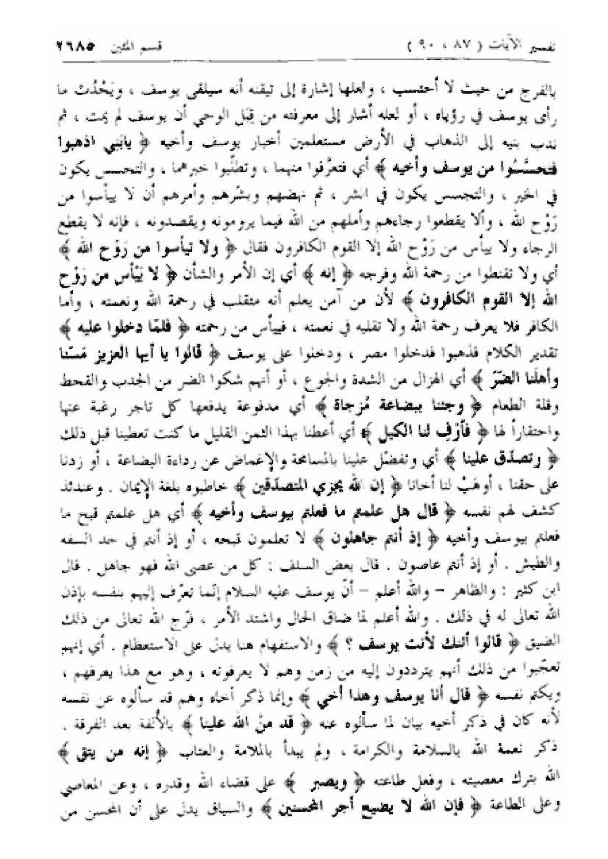 ثم ندب بنيه إلى الذهاب في الأرض مستعلمين أخبار يوسف وأخيه يا بَنِيَّ اذْهَبُوا فَتَحَسَّسُوا مِنْ يُوسُفَ وَأَخِيهِ أي فتعرفوا منهما، وتطلبوا خبرهما، والتحسس يكون في الخير، والتجسس يكون في الشر، ثم نهضهم وبشرهم وأمرهم أن لا ييأسوا من روح الله، وألا يقطعوا رجاءهم وأملهم من الله فيما يرومونه ويقصدونه، فإنه لا يقطع الرجاء ولا ييأس من روح الله إلا القوم الكافرون فقال وَلا تَيْأَسُوا مِنْ رَوْحِ اللَّهِ أي ولا تقنطوا من رحمة الله وفرجه إِنَّهُ أي إن الأمر والشأن لا يَيْأَسُ مِنْ رَوْحِ اللَّهِ إِلَّا الْقَوْمُ الْكافِرُونَ لأن من آمن يعلم أنه متقلب في رحمة الله ونعمته، وأما الكافر فلا يعرف رحمة الله ولا تقلبه في نعمته، فييأس من رحمته