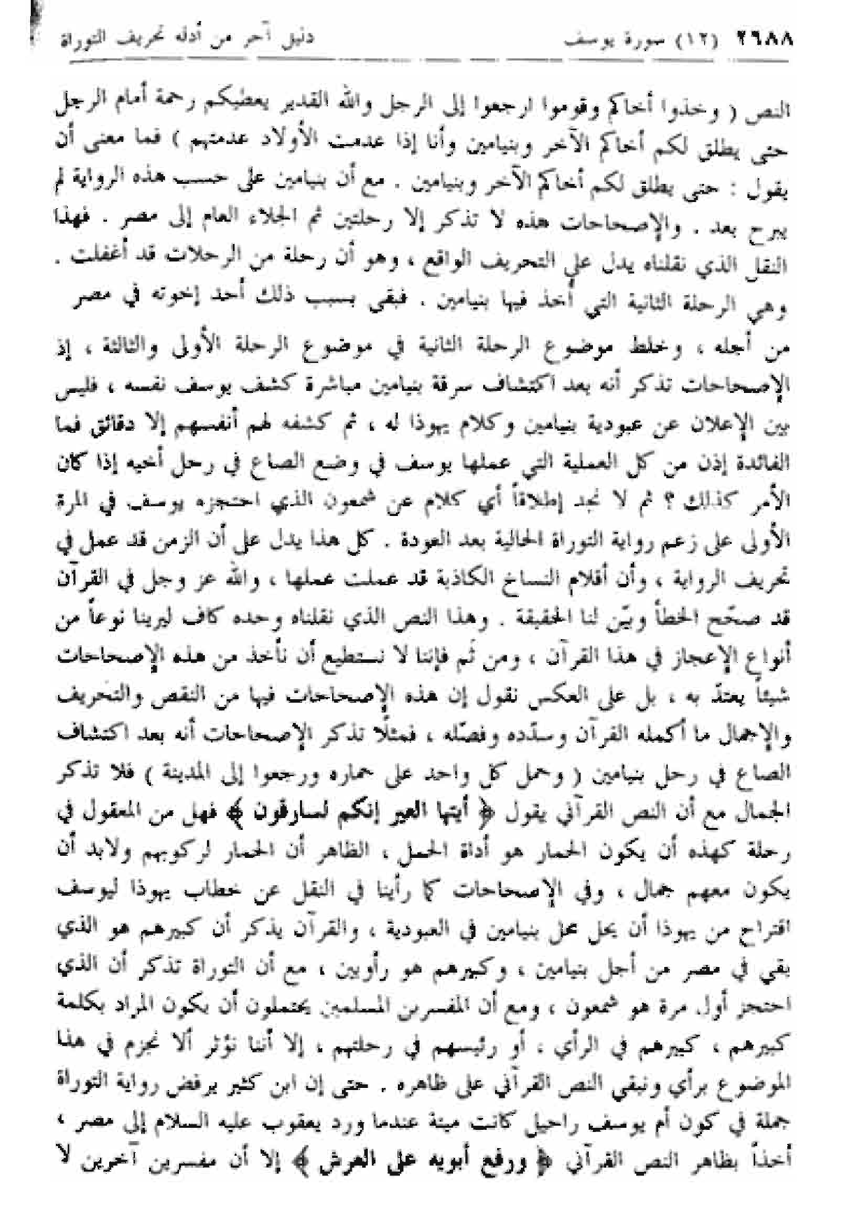 من أجله، وخلط موضوع الرحلة الثانية في موضوع الرحلة الأولى والثالثة، إذ الإصحاحات تذكر أنه بعد اكتشاف سرقة بنيامين مباشرة كشف يوسف نفسه، فليس بين الإعلان عن عبودية بنيامين وكلام يهوذا له، ثم كشفه لهم أنفسهم إلا دقائق فما الفائدة إذن من كل العملية التي عملها يوسف في وضع الصاع في رحل أخيه إذا كان الأمر كذلك؟ ثم لا نجد إطلاقا أي كلام عن شمعون الذي احتجزه يوسف في المرة الأولى على زعم رواية التوراة الحالية بعد العودة. كل هذا يدل على أن الزمن قد عمل في تحريف الرواية، وأن أقلام النساخ الكاذبة قد عملت عملها، والله عزّ وجل في القرآن قد صحح الخطأ وبين لنا الحقيقة. وهذا النص الذي نقلناه وحده كاف ليرينا نوعا من أنواع الإعجاز في هذا القرآن، ومن ثم فإننا لا نستطيع أن نأخذ من هذه الإصحاحات شيئا يعتد به، بل على العكس نقول إن هذه الإصحاحات فيها من النقص