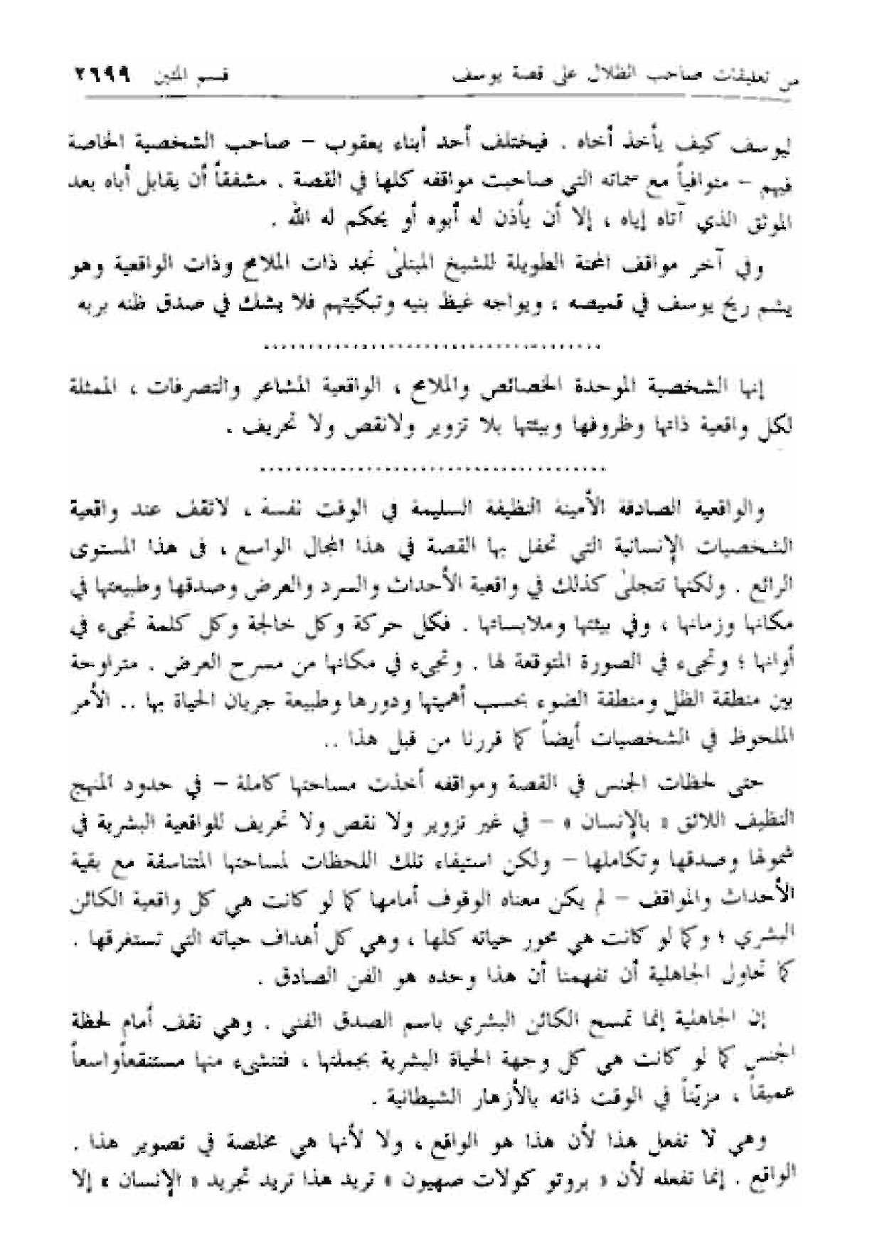 حتى لحظات الجنس في القصة ومواقفه أخذت مساحتها كاملة- في حدود المنهج النظيف اللائق «بالإنسان» - في غير تزوير ولا نقص ولا تحريف للواقعية البشرية في شمولها وصدقها وتكاملها- ولكن استيفاء تلك اللحظات لمساحتها المتناسقة مع بقية الأحداث والمواقف- لم يكن معناه الوقوف أمامها كما لو كانت هي كل واقعية الكائن البشري؛ وكما لو كانت هي محور حياته كلها، وهي كل أهداف حياته التي تستغرقها.