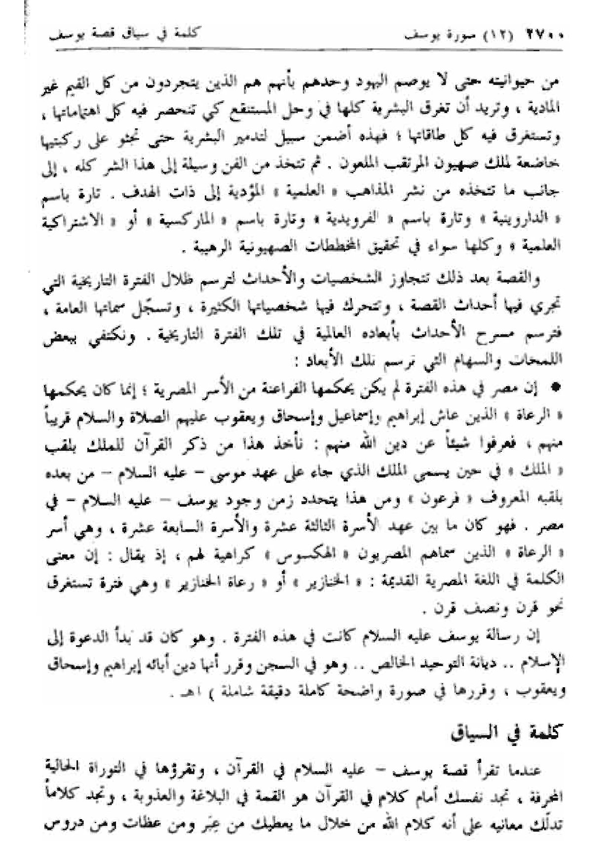 إن مصر في هذه الفترة لم يكن يحكمها الفراعنة من الأسر المصرية؛ إنما كان يحكمها «الرعاة» الذين عاش إبراهيم وإسماعيل وإسحاق ويعقوب عليهم الصلاة والسلام قريبا منهم، فعرفوا شيئا عن دين الله منهم: نأخذ هذا من ذكر القرآن للملك بلقب «الملك» في حين يسمى الملك الذي جاء على عهد موسى- عليه السلام- من بعده بلقبه المعروف «فرعون» ومن هذا يتحدد زمن وجود يوسف- عليه السلام- في مصر. فهو كان ما بين عهد الأسرة الثالثة عشرة والأسرة السابعة عشرة، وهي أسر «الرعاة» الذين سماهم المصريون «الهكسوس» كراهية لهم، إذ يقال: إن معنى الكلمة في اللغة المصرية القديمة: «الخنازير» أو «رعاة الخنازير» وهي فترة تستغرق نحو قرن ونصف قرن.