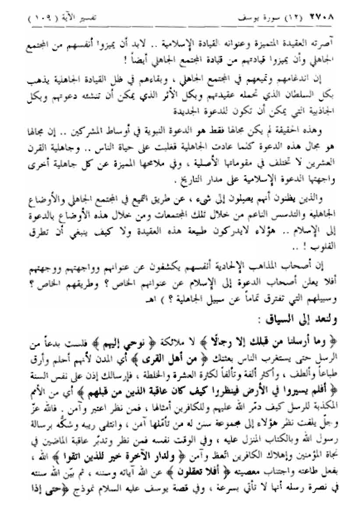 وَما أَرْسَلْنا مِنْ قَبْلِكَ إِلَّا رِجالًا لا ملائكة نُوحِي إِلَيْهِمْ فلست بدعا من الرسل حتى يستغرب الناس بعثتك مِنْ أَهْلِ الْقُرى أي المدن لأنهم أحلم وأرق طباعا وألطف، وأكثر ألفة وتألفا لكثرة العشرة والخلطة، فإرسالك إذن على نفس السنة أَفَلَمْ يَسِيرُوا فِي الْأَرْضِ فَيَنْظُرُوا كَيْفَ كانَ عاقِبَةُ الَّذِينَ مِنْ قَبْلِهِمْ أي من الأمم المكذبة للرسل كيف دمر الله عليهم وللكافرين أمثالها، فمن نظر اعتبر وآمن. فالله عزّ وجل يلفت نظر هؤلاء إلى مجموعة سنن له من تأملها آمن، وانتفى ريبه وشكه برسالة رسول الله وبالكتاب المنزل عليه، وفي الوقت نفسه فمن نظر وتدبر عاقبة الماضين في نجاة المؤمنين وإهلاك الكافرين اتعظ وآمن وَلَدارُ الْآخِرَةِ خَيْرٌ لِلَّذِينَ اتَّقَوْا الله، بفعل طاعته واجتناب معصيته أَفَلا تَعْقِلُونَ عن الله آياته وسننه،