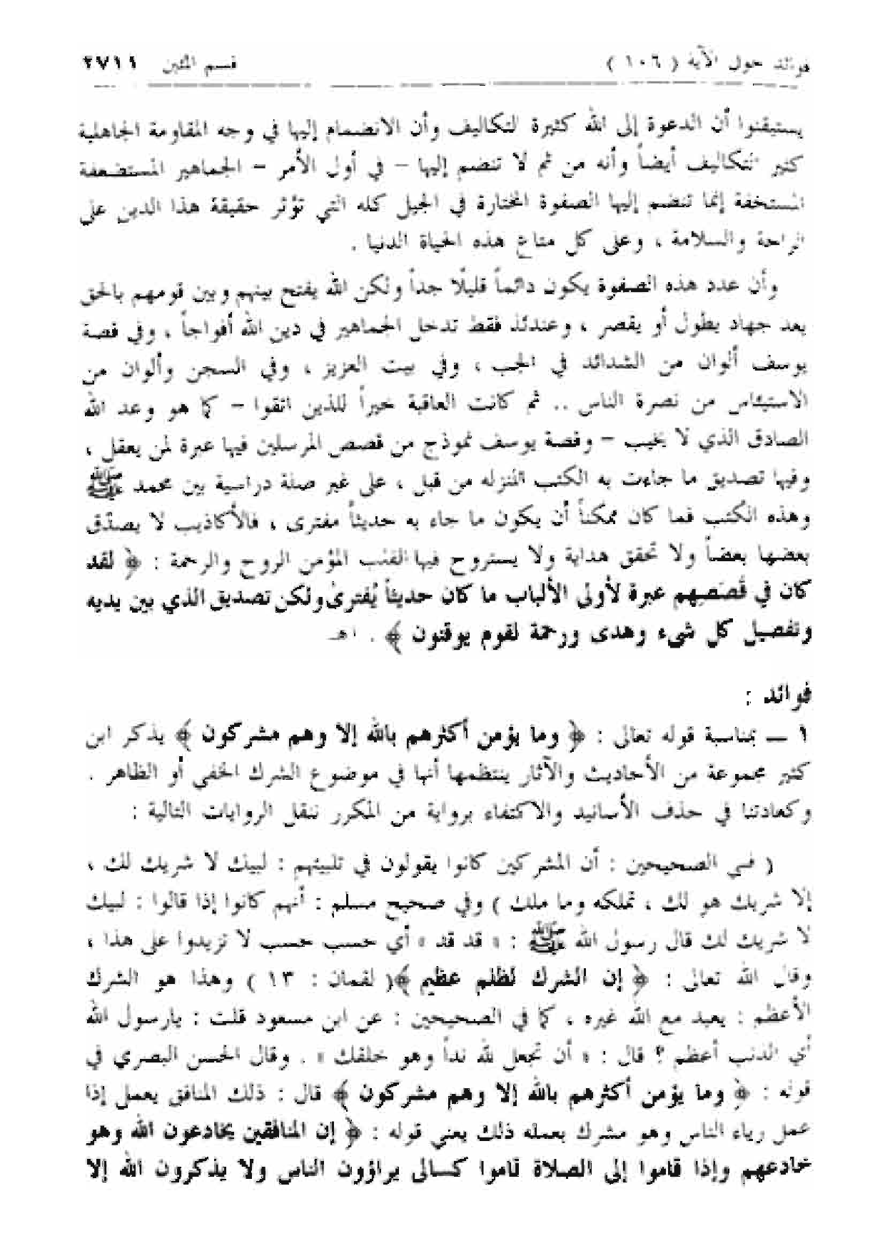 1 - بمناسبة قوله تعالى: وَما يُؤْمِنُ أَكْثَرُهُمْ بِاللَّهِ إِلَّا وَهُمْ مُشْرِكُونَ يذكر ابن كثير مجموعة من الأحاديث والآثار ينتظمها أنها في موضوع الشرك الخفي أو الظاهر.