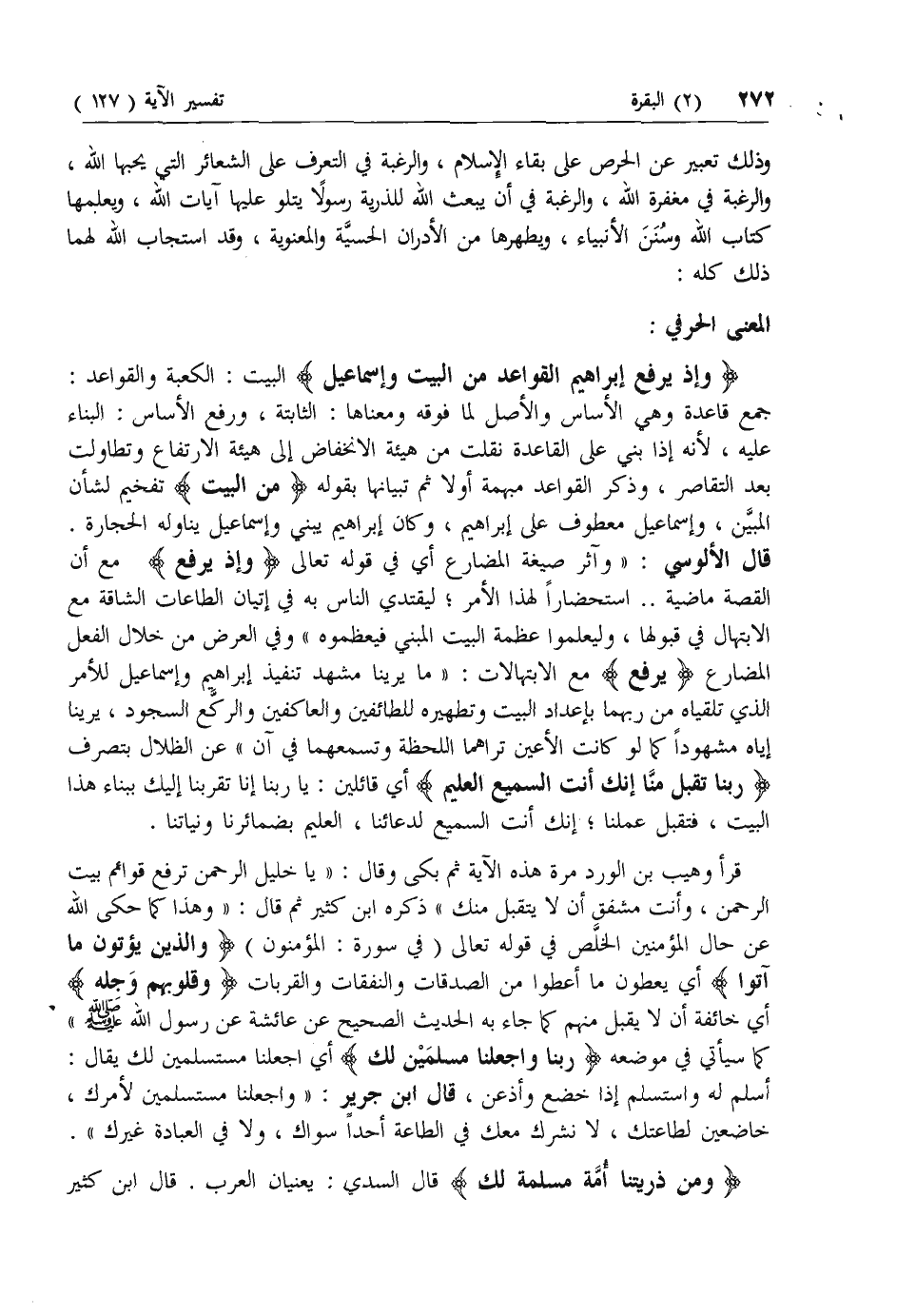 جمع قاعدة وهي الأساس والأصل لما فوقه ومعناها: الثابتة، ورفع الأساس: البناء عليه، لأنه إذا بني على القاعدة نقلت من هيئة الانخفاض إلى هيئة الارتفاع وتطاولت بعد التقاصر، وذكر القواعد مبهمة أولا ثم تبيانها بقوله مِنَ الْبَيْتِ تفخيم لشأن المبين، وإسماعيل معطوف على إبراهيم، وكان إبراهيم يبني وإسماعيل يناوله الحجارة.
