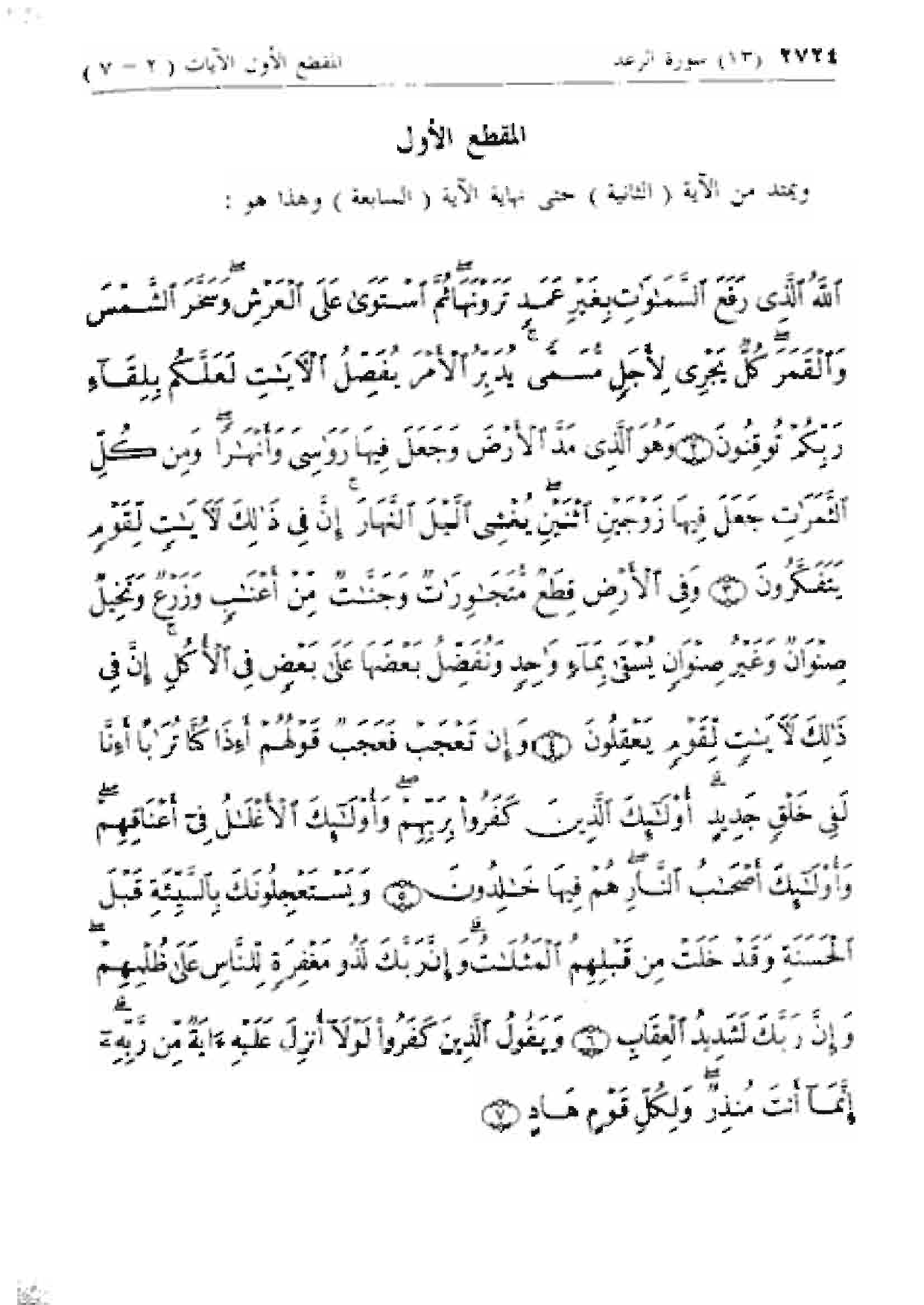 اللَّهُ الَّذِي رَفَعَ السَّماواتِ بِغَيْرِ عَمَدٍ تَرَوْنَها ثُمَّ اسْتَوى عَلَى الْعَرْشِ وَسَخَّرَ الشَّمْسَ وَالْقَمَرَ كُلٌّ يَجْرِي لِأَجَلٍ مُسَمًّى يُدَبِّرُ الْأَمْرَ يُفَصِّلُ الْآياتِ لَعَلَّكُمْ بِلِقاءِ رَبِّكُمْ تُوقِنُونَ (2) وَهُوَ الَّذِي مَدَّ الْأَرْضَ وَجَعَلَ فِيها رَواسِيَ وَأَنْهاراً وَمِنْ كُلِّ الثَّمَراتِ جَعَلَ فِيها زَوْجَيْنِ اثْنَيْنِ يُغْشِي اللَّيْلَ النَّهارَ إِنَّ فِي ذلِكَ لَآياتٍ لِقَوْمٍ يَتَفَكَّرُونَ (3) وَفِي الْأَرْضِ قِطَعٌ مُتَجاوِراتٌ وَجَنَّاتٌ مِنْ أَعْنابٍ وَزَرْعٌ وَنَخِيلٌ صِنْوانٌ وَغَيْرُ صِنْوانٍ يُسْقى بِماءٍ واحِدٍ وَنُفَضِّلُ بَعْضَها عَلى بَعْضٍ فِي الْأُكُلِ إِنَّ فِي ذلِكَ لَآياتٍ لِقَوْمٍ يَعْقِلُونَ (4) وَإِنْ تَعْجَبْ فَعَجَبٌ قَوْلُهُمْ أَإِذا كُنَّا تُراباً أَإِنَّا لَفِي خَلْقٍ جَدِيدٍ أُولئِكَ الَّذِينَ كَفَرُوا بِرَبِّهِمْ وَأُولئِكَ الْأَغْلالُ فِي أَعْناقِهِمْ وَأُولئِكَ أَصْحابُ النَّارِ هُمْ فِيها خالِدُونَ (5) وَيَسْتَعْجِلُونَكَ بِالسَّيِّئَةِ قَبْلَ الْحَسَنَةِ وَقَدْ خَلَتْ مِنْ قَبْلِهِمُ الْمَثُلاتُ وَإِنَّ رَبَّكَ لَذُو مَغْفِرَةٍ لِلنَّاسِ عَلى ظُلْمِهِمْ وَإِنَّ رَبَّكَ لَشَدِيدُ الْعِقابِ (6)