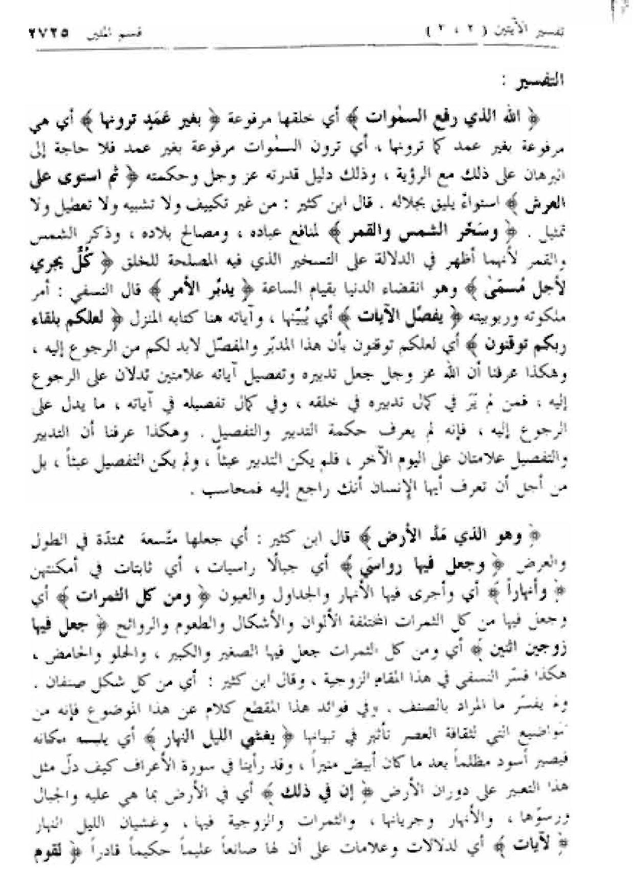 اللَّهُ الَّذِي رَفَعَ السَّماواتِ أي خلقها مرفوعة بِغَيْرِ عَمَدٍ تَرَوْنَها أي هي مرفوعة بغير عمد كما ترونها، أي ترون السموات مرفوعة بغير عمد فلا حاجة إلى البرهان على ذلك مع الرؤية، وذلك دليل قدرته عزّ وجل وحكمته ثُمَّ اسْتَوى عَلَى الْعَرْشِ استواء يليق بجلاله. قال ابن كثير: من غير تكييف ولا تشبيه ولا تعطيل ولا تمثيل. وَسَخَّرَ الشَّمْسَ وَالْقَمَرَ لمنافع عباده، ومصالح بلاده، وذكر الشمس والقمر لأنهما أظهر في الدلالة على التسخير الذي فيه المصلحة للخلق كُلٌّ يَجْرِي لِأَجَلٍ مُسَمًّى وهو انقضاء الدنيا بقيام الساعة يُدَبِّرُ الْأَمْرَ قال النسفي: أمر ملكوته وربوبيته يُفَصِّلُ الْآياتِ أي يبينها، وآياته هنا كتابه المنزل لَعَلَّكُمْ بِلِقاءِ رَبِّكُمْ تُوقِنُونَ أي لعلكم توقنون بأن هذا المدبر والمفصل لا بد لكم من الرجوع إليه، وهكذا عرفنا أن الله عزّ وجل جعل تدبيره وتفصيل آياته علامتين تدلان على الرجوع إليه، فمن لم ير في كمال تدبيره في خلقه، وفي كمال تفصيله في آياته، ما يدل على الرجوع إليه، فإنه لم يعرف حكمة التدبير والتفصيل. وهكذا عرفنا أن التدبير والتفصيل علامتان على اليوم الآخر، فلم يكن التدبير عبثا، ولم يكن التفصيل عبثا، بل من أجل أن تعرف أيها الإنسان أنك راجع إليه فمحاسب.