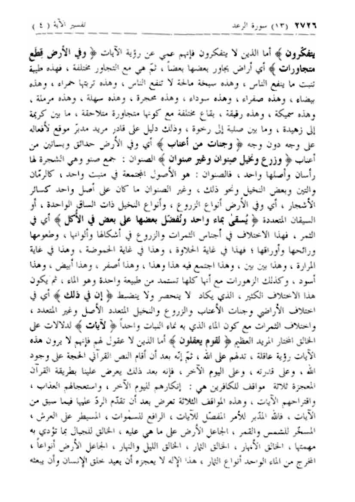 وَفِي الْأَرْضِ قِطَعٌ مُتَجاوِراتٌ أي أراض يجاور بعضها بعضا، ثم هي مع التجاور مختلفة، فهذه طيبة تنبت ما ينفع الناس، وهذه سبخة مالحة لا تنفع الناس، وهذه تربتها حمراء، وهذه بيضاء، وهذه صفراء، وهذه سوداء، وهذه محجرة، وهذه سهلة، وهذه مرملة، وهذه سميكة، وهذه رقيقة، بقاع مختلفة مع كونها متجاورة متلاحقة، ما بين كريمة إلى زهيدة، وما بين صلبة إلى رخوة، وذلك دليل على قادر مريد مدبر موقع لأفعاله على وجه دون وجه وَجَنَّاتٌ مِنْ أَعْنابٍ أي وفي الأرض حدائق وبساتين من أعناب وَزَرْعٌ وَنَخِيلٌ صِنْوانٌ وَغَيْرُ صِنْوانٍ الصنوان: جمع صنو وهي الشجرة لها رأسان وأصلها واحد، فالصنوان: هو الأصول المجتمعة في منبت واحد، كالرمان والتين وبعض النخيل ونحو ذلك، وغير الصنوان ما كان على أصل واحد كسائر الأشجار، أي وفي الأرض أنواع الزروع، وأنواع النخيل ذات الساق الواحدة، أو السيقان المتعددة يُسْقى بِماءٍ واحِدٍ وَنُفَضِّلُ بَعْضَها عَلى بَعْضٍ فِي الْأُكُلِ أي في الثمر، فهذا الاختلاف في أجناس الثمرات والزروع في أشكالها وألوانها، وطعومها ورائحها وأوراقها؛ فهذا في غاية الحلاوة، وهذا في غاية الحموضة، وهذا في غاية المرارة، وهذا بين بين، وهذا اجتمع فيه هذا وهذا، وهذا أصفر، وهذا أبيض، وهذا أسود، وكذلك الزهورات مع أنها كلها تستمد من طبيعة واحدة وهو الماء، ثم يكون هذا الاختلاف الكثير، الذي يكاد لا ينحصر ولا ينضبط إِنَّ فِي ذلِكَ أي في اختلاف الأراضي وجنات الأعناب والزروع والنخيل المتعدد الأصل وغير المتعدد، واختلاف الثمرات مع كون الماء الذي به نماء النبات واحدا لَآياتٍ لدلالات على الخالق المختار المريد العظيم لِقَوْمٍ يَعْقِلُونَ أما الذين لا عقول لهم فإنهم لا يرون هذه الآيات رؤية عاقلة، تدلهم على الله، ثم إنه بعد أن أقام النص القرآني الحجة على وجود الله، وعلى قدرته، وعلى اليوم الآخر، فإنه بعد ذلك يعرض علينا بطريقة القرآن المعجزة ثلاثة مواقف للكافرين هي: إنكارهم لليوم الآخر، واستعجالهم العذاب، واقتراحهم الآيات، وهذه المواقف الثلاثة تعرض بعد أن تقدم الرد عليها فيما سبق من الآيات، فالله المدبر للأمر المفصل للآيات، الرافع للسماوات، المسيطر على العرش، المسخر للشمس والقمر، الجاعل الأرض على ما هي عليه، الخالق للجبال بما تؤدي به مهمتها، الخالق الأنهار، الخالق الثمار، الخالق الليل والنهار، الجاعل الأرض أنواعا، المخرج من الماء الواحد أنواع الثمار، هذا الإله لا يعجزه أن يعيد خلق الإنسان وأن يبعثه