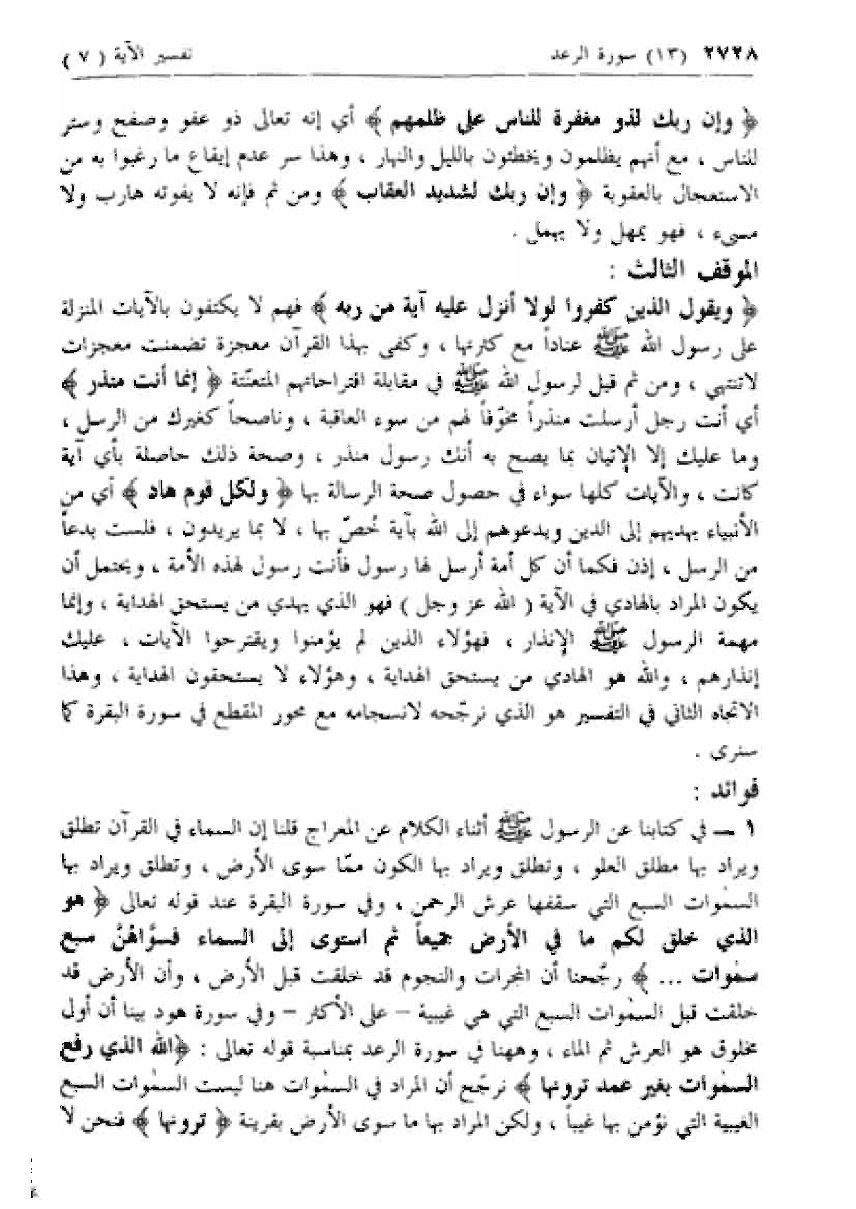 1 - في كتابنا عن الرسول صلى الله عليه وسلم أثناء الكلام عن المعراج قلنا إن السماء في القرآن تطلق ويراد بها مطلق العلو، وتطلق ويراد بها الكون مما سوى الأرض، وتطلق ويراد بها السموات السبع التي سقفها عرش الرحمن، وفي سورة البقرة عند قوله تعالى هُوَ الَّذِي خَلَقَ لَكُمْ ما فِي الْأَرْضِ جَمِيعاً ثُمَّ اسْتَوى إِلَى السَّماءِ فَسَوَّاهُنَّ سَبْعَ سَماواتٍ ... رجحنا أن المجرات والنجوم قد خلقت قبل الأرض، وأن الأرض قد خلقت قبل السموات السبع التي هي غيبية- على الأكثر- وفي سورة هود بينا أن أول مخلوق هو العرش ثم الماء، وهاهنا في سورة الرعد بمناسبة قوله تعالى: اللَّهُ الَّذِي رَفَعَ السَّماواتِ بِغَيْرِ عَمَدٍ تَرَوْنَها نرجح أن المراد في السموات هنا ليست السموات السبع الغيبية التي نؤمن بها غيبا، ولكن المراد بها ما سوى الأرض بقرينة تَرَوْنَها فنحن لا