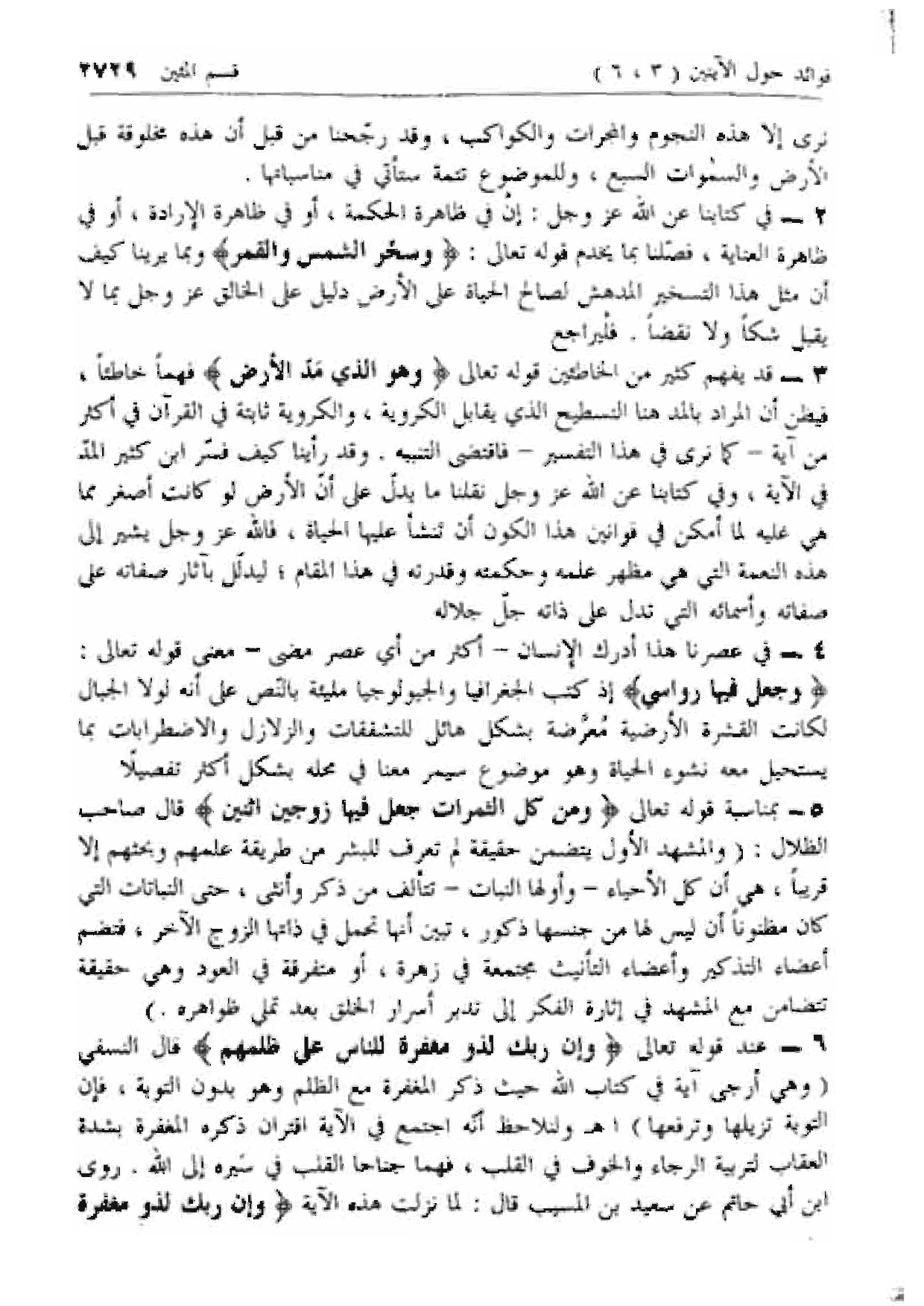 3 - قد يفهم كثير من الخاطئين قوله تعالى وَهُوَ الَّذِي مَدَّ الْأَرْضَ فهما خاطئا، فيظن أن المراد بالمد هنا التسطيح الذي يقابل الكروية، والكروية ثابتة في القرآن في أكثر من آية- كما نرى في هذا التفسير- فاقتضى التنبيه. وقد رأينا كيف فسر ابن كثير المد في الآية، وفي كتابنا عن الله عزّ وجل نقلنا ما يدل على أن الأرض لو كانت أصغر مما هي عليه لما أمكن في قوانين هذا الكون أن تنشأ عليها الحياة، فالله عزّ وجل يشير إلى هذه النعمة التي هي مظهر علمه وحكمته وقدرته في هذا المقام؛ ليدلل بآثار صفاته على صفاته وأسمائه التي تدل على ذاته جل جلاله