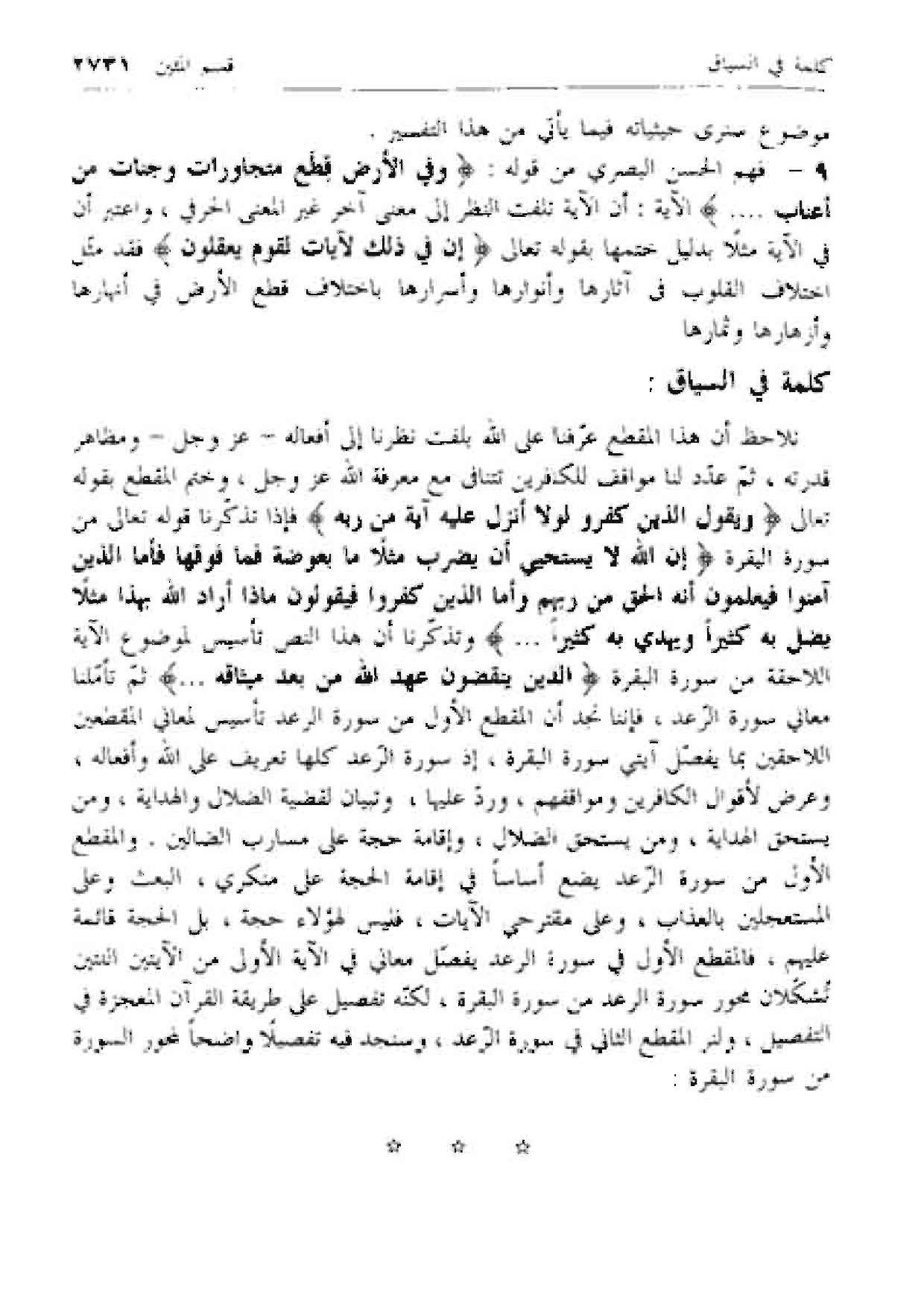 نلاحظ أن هذا المقطع عرفنا على الله بلفت نظرنا إلى أفعاله- عزّ وجل- ومظاهر قدرته، ثم عدد لنا مواقف للكافرين تتنافى مع معرفة الله عزّ وجل، وختم المقطع بقوله تعالى وَيَقُولُ الَّذِينَ كَفَرُوا لَوْلا أُنْزِلَ عَلَيْهِ آيَةٌ مِنْ رَبِّهِ فإذا تذكرنا قوله تعالى من سورة البقرة إِنَّ اللَّهَ لا يَسْتَحْيِي أَنْ يَضْرِبَ مَثَلًا ما بَعُوضَةً فَما فَوْقَها فَأَمَّا الَّذِينَ آمَنُوا فَيَعْلَمُونَ أَنَّهُ الْحَقُّ مِنْ رَبِّهِمْ وَأَمَّا الَّذِينَ كَفَرُوا فَيَقُولُونَ ماذا أَرادَ اللَّهُ بِهذا مَثَلًا يُضِلُّ بِهِ كَثِيراً وَيَهْدِي بِهِ كَثِيراً ... وتذكرنا أن هذا النص تأسيس لموضوع الآية اللاحقة من سورة البقرة الَّذِينَ يَنْقُضُونَ عَهْدَ اللَّهِ مِنْ بَعْدِ مِيثاقِهِ ... ثم تأملنا معاني سورة الرعد، فإننا نجد أن المقطع الأول من سورة الرعد تأسيس لمعاني المقطعين اللاحقين بما يفصل آيتي سورة البقرة، إذ سورة الرعد كلها تعريف على الله وأفعاله، وعرض لأقوال الكافرين ومواقفهم، ورد عليها، وتبيان لقضية الضلال والهداية، ومن يستحق الهداية، ومن يستحق الضلال، وإقامة حجة على مسارب الضالين. والمقطع الأول من سورة الرعد يضع أساسا في إقامة الحجة على منكري، البعث وعلى المستعجلين بالعذاب، وعلى مقترحي الآيات، فليس لهؤلاء حجة، بل الحجة قائمة عليهم، فالمقطع الأول في سورة الرعد يفصل معاني في الآية الأولى من الآيتين اللتين تشكلان محور سورة الرعد من سورة البقرة، لكنه تفصيل على طريقة القرآن المعجزة في التفصيل، ولنر المقطع الثاني في سورة الرعد، وسنجد فيه تفصيلا واضحا لمحور السورة من سورة البقرة: