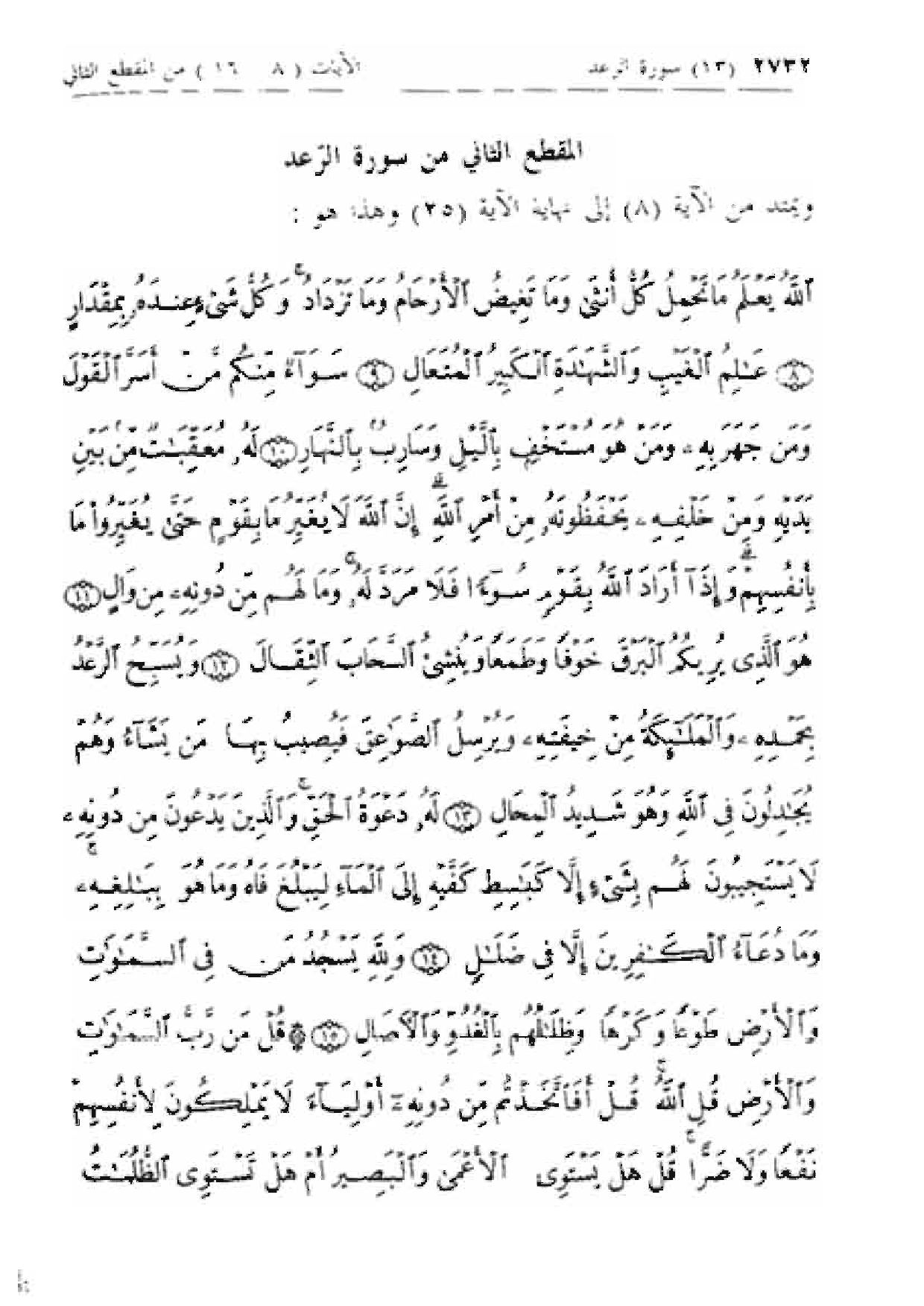اللَّهُ يَعْلَمُ ما تَحْمِلُ كُلُّ أُنْثى وَما تَغِيضُ الْأَرْحامُ وَما تَزْدادُ وَكُلُّ شَيْءٍ عِنْدَهُ بِمِقْدارٍ (8) عالِمُ الْغَيْبِ وَالشَّهادَةِ الْكَبِيرُ الْمُتَعالِ (9) سَواءٌ مِنْكُمْ مَنْ أَسَرَّ الْقَوْلَ وَمَنْ جَهَرَ بِهِ وَمَنْ هُوَ مُسْتَخْفٍ بِاللَّيْلِ وَسارِبٌ بِالنَّهارِ (10) لَهُ مُعَقِّباتٌ مِنْ بَيْنِ يَدَيْهِ وَمِنْ خَلْفِهِ يَحْفَظُونَهُ مِنْ أَمْرِ اللَّهِ إِنَّ اللَّهَ لا يُغَيِّرُ ما بِقَوْمٍ حَتَّى يُغَيِّرُوا ما بِأَنْفُسِهِمْ وَإِذا أَرادَ اللَّهُ بِقَوْمٍ سُوْءاً فَلا مَرَدَّ لَهُ وَما لَهُمْ مِنْ دُونِهِ مِنْ والٍ (11) هُوَ الَّذِي يُرِيكُمُ الْبَرْقَ خَوْفاً وَطَمَعاً وَيُنْشِئُ السَّحابَ الثِّقالَ (12)