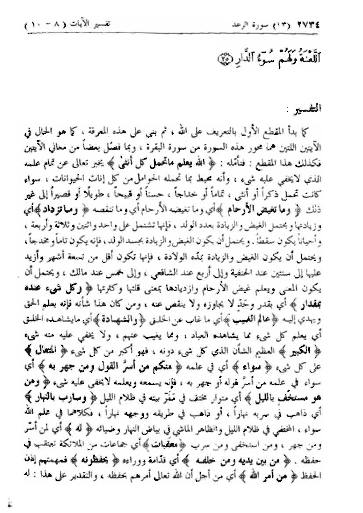 كما بدأ المقطع الأول بالتعريف على الله، ثم بنى على هذه المعرفة، كما هو الحال في الآيتين اللتين هما محور هذه السورة من سورة البقرة، وبما فصل بعضا من معاني الآيتين فكذلك هذا المقطع: فتأمله: اللَّهُ يَعْلَمُ ما تَحْمِلُ كُلُّ أُنْثى يخبر تعالى عن تمام علمه الذي لا يخفي عليه شئ، وأنه محيط بما تحمله الحوامل من كل إناث الحيوانات، سواء كانت تحمل ذكرا أو أنثى، تماما أو خداجا، حسنا أو قبيحا، طويلا أو قصيرا إلى غير ذلك وَما تَغِيضُ الْأَرْحامُ أي وما تغيضه الأرحام أي وما تنقصه وَما تَزْدادُ أي وزيادتها ويحتمل الغيض والزيادة بعدد الولد، فإنها تشتمل على واحد واثنين وثلاثة وأربعة، وأحيانا يكون سقطا. ويحتمل أن يكون الغيض والزيادة بجسد الولد، فإنه يكون تاما ومخدجا، ويحتمل أن يكون الغيض والزيادة بمدة الولادة، فإنها تكون أقل من تسعة أشهر وأزيد عليها إلى سنتين عند الحنفية وإلى أربع عند الشافعي، وإلى خمس عند مالك، ويحتمل أن يكون المعنى ويعلم غيض الأرحام وازديادها بمعنى قلتها وكثرتها وَكُلُّ شَيْءٍ عِنْدَهُ بِمِقْدارٍ أي بقدر وحد لا يجاوزه ولا ينقص عنه، ومن كان هذا شأنه فإنه يعلم الحق ويهدي إليه