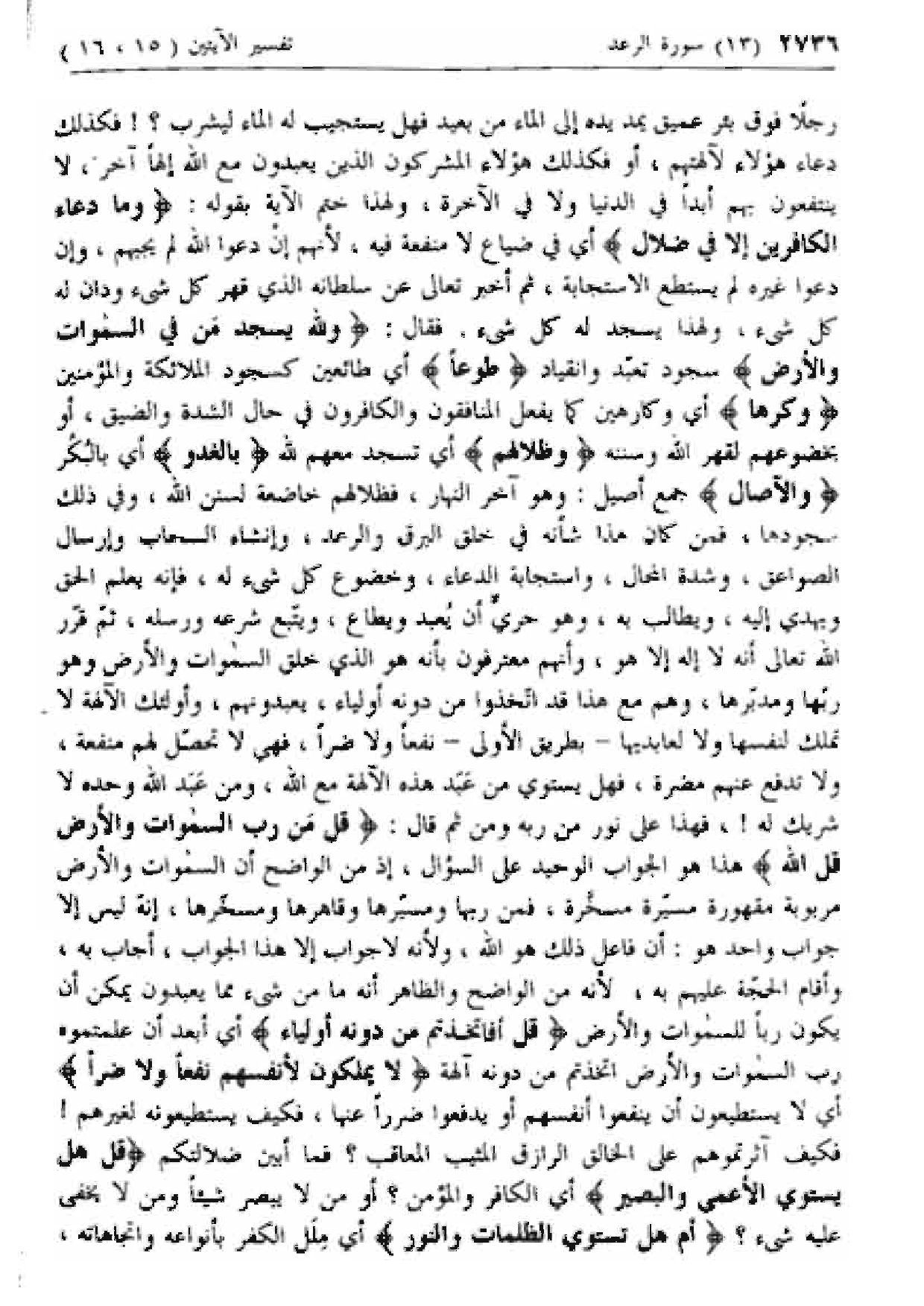 طائعين كسجود الملائكة والمؤمنين وَكَرْهاً أي وكارهين كما يفعل المنافقون والكافرون في حال الشدة والضيق، أو بخضوعهم لقهر الله وسننه وَظِلالُهُمْ أي تسجد معهم لله بِالْغُدُوِّ أي بالبكر وَالْآصالِ جمع أصيل: وهو آخر النهار، فظلالهم خاضعة لسنن الله، وفي ذلك سجودها، فمن كان هذا شأنه في خلق البرق والرعد، وإنشاء السحاب وإرسال الصواعق، وشدة المحال، واستجابة الدعاء، وخضوع كل شئ له، فإنه يعلم الحق ويهدي إليه، ويطالب به، وهو حري أن يعبد ويطاع، ويتبع شرعه ورسله، ثم قرر الله تعالى أنه لا إله إلا هو، وأنهم معترفون بأنه هو الذي خلق السموات والأرض وهو ربها ومدبرها، وهم مع هذا قد اتخذوا من دونه أولياء، يعبدونهم، وأولئك الآلهة لا تملك لنفسها ولا لعابديها- بطريق الأولى- نفعا ولا ضرا، فهي لا تحصل لهم منفعة، ولا تدفع عنهم مضرة، فهل يستوي من عبد هذه الآلهة مع الله، ومن عبد الله وحده لا شريك له!، فهذا على نور من ربه